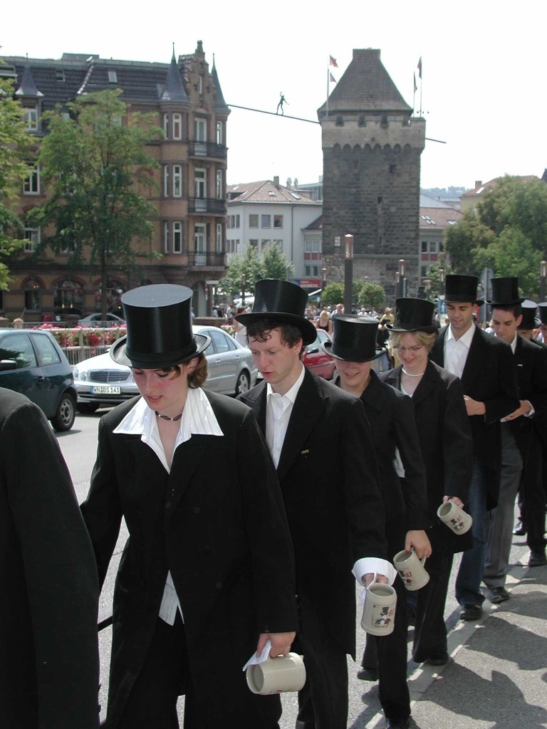 Am Nachmittag trafen sich die Absolventinnen und Absolventen auf dem Campus in der Stadtmitte. Nach der Verbrennung der besonders ungeliebten Skripte begann der Kandelmarsch durch die historische Altstadt von Esslingen mit einem Fuß auf der Straße, den anderen auf dem Gehsteig. Hier wurden die frischgebackenen Ingenieure und Betriebswirte zum letzten Mal in ihrem Studium auf eine harte Probe gestellt. Mit Frack und Zylinder angetan, den Bierkrug in der Hand, marschierten sie durch Esslingen bei strahlend blauem Himmel und 34° C im Schatten. Manch einer wünschte sich da ein sich selbstfüllender Bierkrug. Doch der muss erst noch erfunden werden.