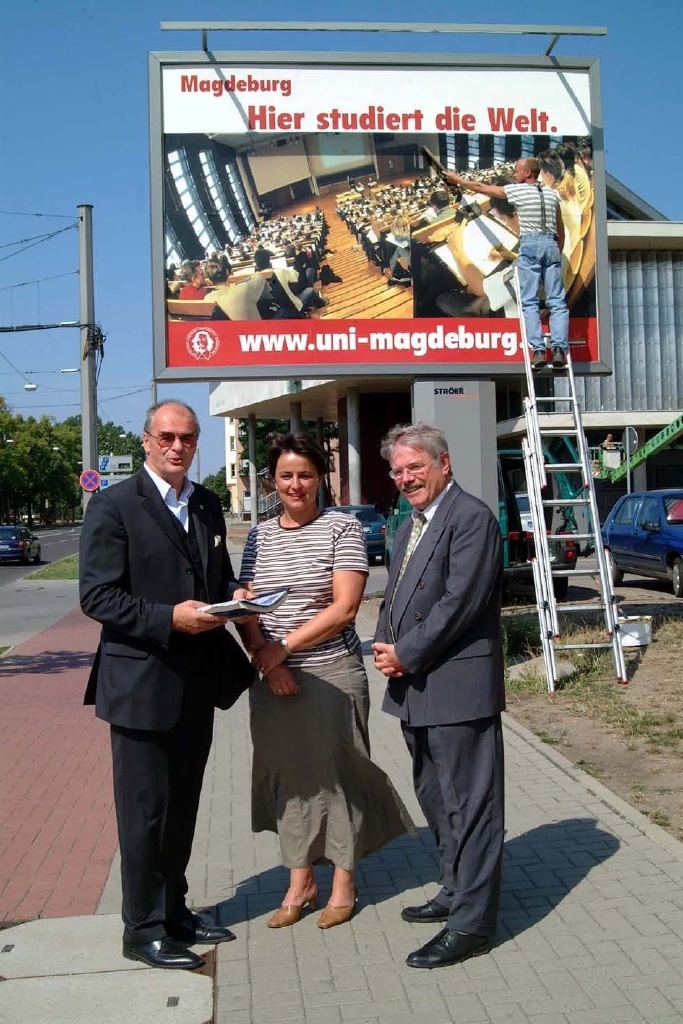 Die Uni Magdeburg startet mit Unterstützung der Ströer City Marketing GmbH heute in Magdeburg und in den nächsten Tagen auch bundesweit eine Initiative zur Stärkung Magdeburgs als Hochschulstandort. Mit dieser Werbung, so Rektor Professor Klaus Erich Pollmann bei der Plakatierung am Standort Rathenau-Straße/Universitätsbibliothek, wollen wir auf unsere junge dynamische Universität verweisen und diese stärker ins Bewusstsein unserer Bevölkerung rücken. In einer Zeit, in der über Strukturmaßnahmen und Finanzierungsprobleme der Universitäten in der Politik und Öffentlichkeit diskutiert wird, möchten wir über diese Imagewerbung mehr Originalität und Optimismus nach außen tragen. Unser Jubiläum "50 Jahre Hochschulstandort Magdeburg - 10 Jahre Otto-von-Guericke-Universität" ist ein weiterer Anlass, diese Werbung in den nächsten Tagen und Wochen bundesweit durchzuführen, die bereits zu Beginn des Jahres geplant war, informierte der Rektor weiter. In den nächsten Jahren werden mehr als die Hälfte der Studierenden aus anderen Bundesländern und dem Ausland kommen und Magdeburg wird keine Regionaluniversität mehr sein.