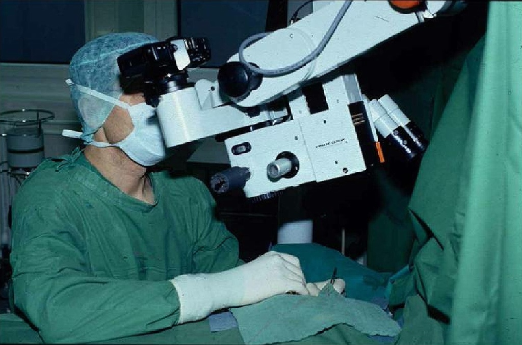 Chirurgen operieren mit OP-Mikroskop und kleinen Instrumenten feinste Blutgefäße