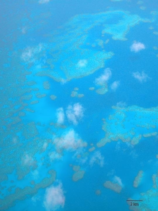 Luftbildaufnahme von Korallenriffen im Nordatlantik, nordöstlich Bermuda. Hier in der Sargassosee wurde vor 15 Jahren zum ersten Mal ein winziger einzelliger Organismus, Prochlorococcus marinus, beschrieben. Dieses z. T. auch als Mikroalge oder Picophytoplankton bezeichnete Cyanobakterium bevölkert die tropischen und subtropischen Teile der Weltmeere in unvorstellbaren Mengen Schätzungen von Meeresforschern ergaben eine Populationsgröße von wenigstens 1027 Zellen, eine 1 mit 27 Nullen. Diese Zahl bleibt etwa konstant, obwohl sich die einzelnen Zellen in dieser Population weltweit im Durchschnitt einmal pro Tag teilen. Damit leistet Prochlorococcus einen grundlegenden Beitrag am Anfang der Nahrungsketten im Ozean und zur biologischen Sauerstoffbildung. Die Genomanalyse von Prochlorococcus ist die erste derartige Untersuchung eines ökologisch hoch relevanten Organismus.