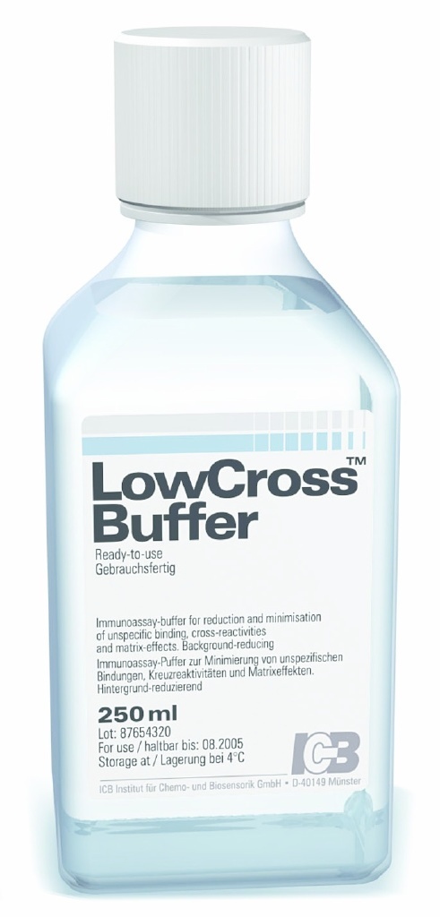 Jeder, der Immunoassays im biochemischen Labor entwickelt und anwendet, kennt das Problem der Kreuzreaktivitäten und unspezifischen Bindungen. Insbesondere bei Multianalytanwendungen machen sich Kreuzreaktivitäten störend bemerkbar. Dieses Problem hatten auch die Forscher im Institut für Chemo- und Biosensorik (ICB). Unzufrieden mit den bisher erhältlichen Pufferlösungen entwickelten sie kurzerhand einen eigenen Puffer. Direkt aus dem Forschungslabor kommt daher der neu entwickelte LowCross-Puffer, der mit seinen besonderen Eigenschaften sämtliche unerwünschten Effekte bei Immunoassays unterdrückt. Der LowCrossTMBuffer ist nicht nur geeignet für ELISA, EIA oder Western Blots, sondern läßt sich auch hervorragend einsetzen bei Proteinchips und Multianalyt Immunoassays.