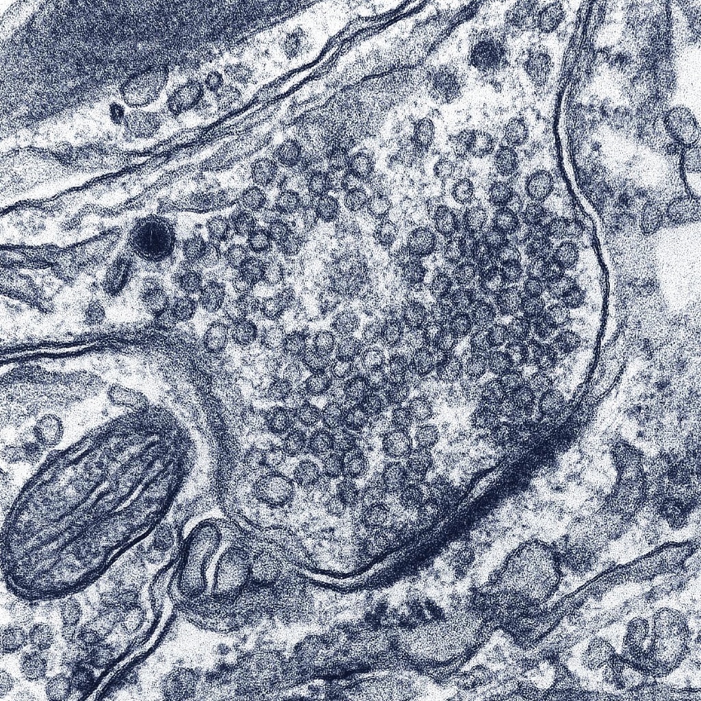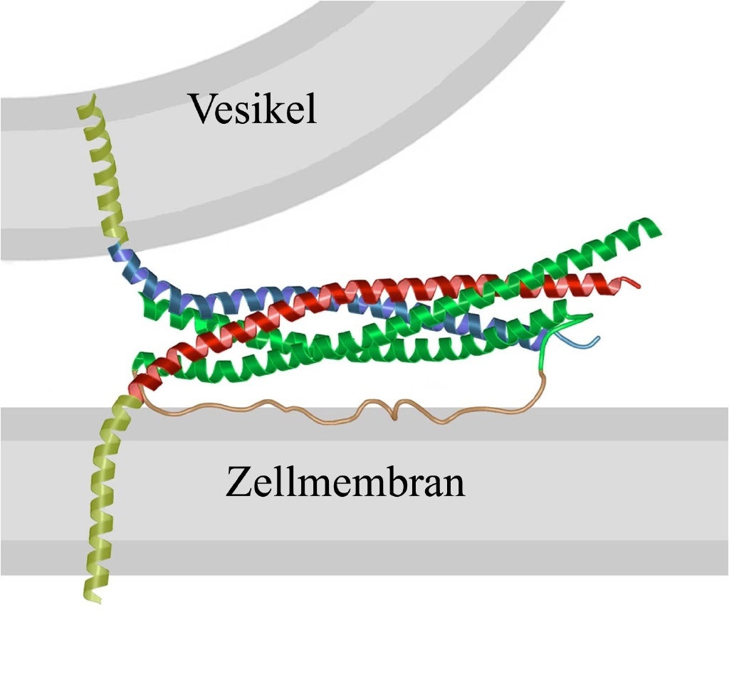 Ein zweiter Arbeitsansatz konzentrierte sich auf die molekularen Akteure des Freisetzungsprozesses. Jüngste Untersuchungen haben ergeben, dass sich nach der Anlagerung eines Vesikels an die Zellmembran ein so genannter "SNARE"-Komplex bildet. Dieser besteht aus Molekülen, von denen einige (SNAP25 und Syntaxin) in der Zellmembran verankert sind und ein weiteres (Synaptobrevin) in der Vesikelmembran. Durch die Bildung des Komplexes werden die beiden Strukturen aneinandergeheftet. Ähnliche Reaktionen finden in vielen Zelltypen und dort auch an vielen Stellen statt. Wo immer innerhalb der Zelle Membranstrukturen fusionieren, sind sehr ähnliche Moleküle wirksam, so zum Beispiel in den Zellbestandteilen endoplasmatisches Retikulum, im Golgiapparat und an den Endosomen. Das Besondere im Nervensystem ist, dass der Prozess offensichtlich nicht zur Vollendung gelangt, sondern in einem späten Stadium der Komplexbildung innehält und auf das auslösende Signal - den Kalziumanstieg - wartet. Dadurch entsteht ein "Vorrat" an sekretionsbereiten Vesikeln, die, wann immer die Kalziumkonzentration ansteigt, innerhalb von Bruchteilen einer Tausendstelsekunde freigesetzt werden können. Um die Moleküle zu identifizieren, die für diese Vorratshaltung verantwortlich sind, haben die Wissenschaftler Untersuchungen an Nebennierenzellen durchgeführt, die im Stresszustand das Hormon Adrenalin ausschütten. Auch dieser Prozess funktioniert nach dem Prinzip der Vorratshaltung wie in Nervenzellen, hat aber den Vorteil, dass sich in den relevanten Zelltypen die beteiligten Moleküle leichter manipulieren lassen. Ausgangspunkt der Untersuchungen war ein Mäusestamm, in dem durch genetische Manipulation eine der Komponenten des SNARE-Komplexes, das Protein SNAP25, eliminiert ist. Aus den Nebennierenzellen dieser Mutante lassen sich Kulturen anlegen. Eine biophysikalische Analyse dieser Zellen ergab, wie erwartet, dass der Vorrat an sekretionsbereiten Speichervesikeln leer war; es war nur eine sehr langsam ablaufende Freisetzung (Sekretion) messbar. Behandelte man solche Zellen jedoch mit einem Virus, welcher die genetische Information für SNAP25 enthielt, so exprimierten die Zellen das Protein und erlangten gleichzeitig auch wieder ihre Sekretionsfähigkeit. Dies bestätigte, dass SNAP25 für die Sekretion essenziell ist.