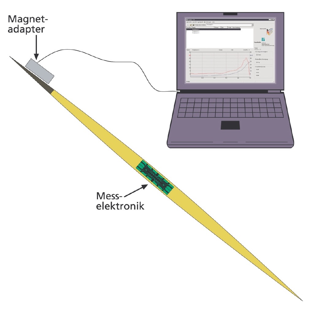 Ingenieure vom Magdeburger Fraunhofer-Institut für Fabrikbetrieb und -automatisierung IFF um den Forscher Ralf Warnemünde haben jetzt gemeinsam mit Experten vom Olympiastützpunkt Magdeburg einen "Digitalen Wurfspeer " entwickelt, der sich rein äußerlich kaum vom gewöhnlichen Sportgerät unterscheidet und unter normalen Trainingsbedingungen getestet werden kann. Der Clou: Die Beschleunigungssensoren und Mikro-Prozessoren sind ausgesprochen klein. Das ganze Hightech-Paket wiegt nur etwa 75 Gramm. Der Speer ist damit nur etwa knapp zehn Prozent schwerer als die üblichen Wettkampfgeräte.