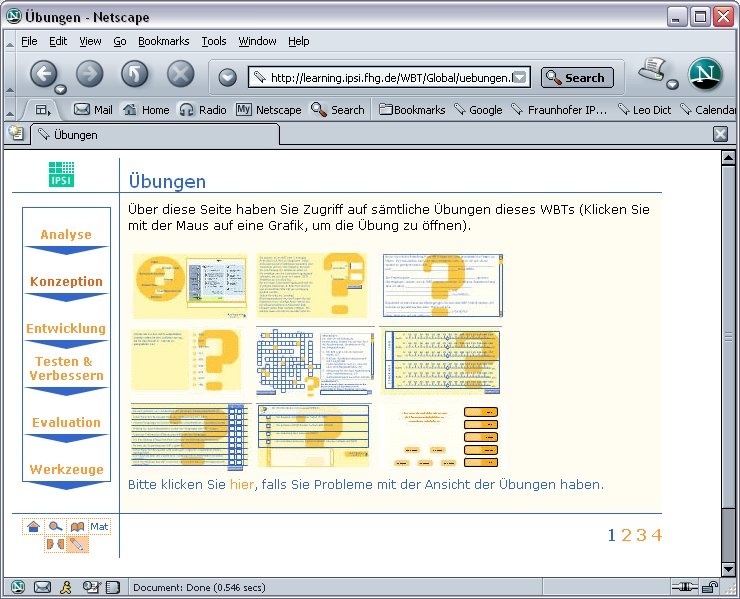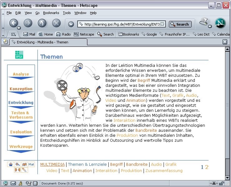 Ist das WBT effizient? Erreicht es den gewünschten Lernerfolg? Um diesen Fragen nachzugehen, liefert Modul 5 - "Evaluation" - einen Überblick über die gängigsten empirischen Testverfahren inklusive einiger Testvorlagen; im Modul 6 -"Werkzeuge" werden abschließend die bekanntesten Autorenwerkzeuge, z.B. Flash, Dreamweaver, Instructor etc. zum Erstellen eines WBTs vorgestellt.