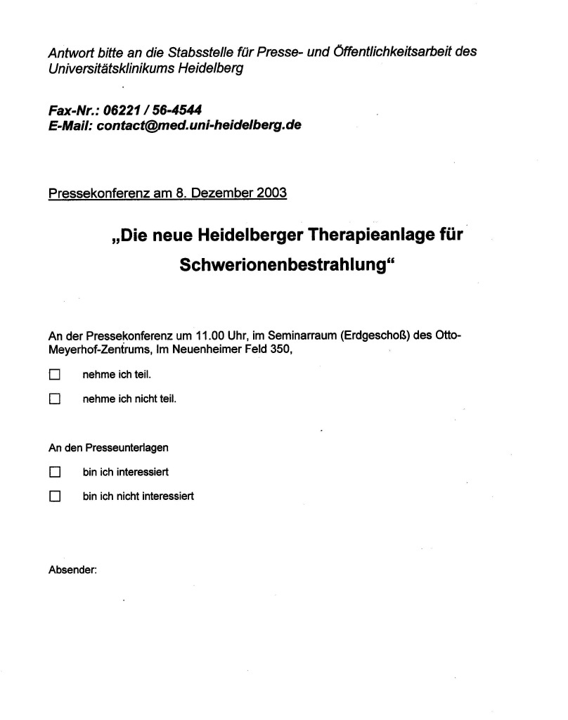 Am Universitätsklinikum Heidelberg wird eine Einrichtung zur Krebsbehandlung mit Schwerionenstrahlung errichtet, die 2006 in Betrieb gehen wird und eine bedeutsame Versorgungslücke bei der Behandlung bislang unheilbarer Tumoren schließt. Der Bau des in Deutschland und Europa einmaligen Projektes auf dem Heidelberger Klinikumsgelände hat in diesen Tagen begonnen. Die Kosten für die Errichtung der innovativen Anlage betragen ca. 72 Millionen Euro und werden zu gleichen Teilen vom Bund und vom Klinikum getragen. Pro Jahr sollen mindestens 1.000 Patienten mit inoperablen Schädelbasis- und Hirntumoren, Weichteilsarkomen und Prostatakarzinomen überwiegend ambulant behandelt werden.