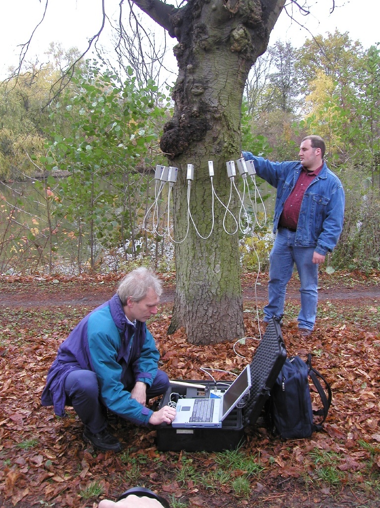 "Die Bäume sind ja fast alle krank hier!". Die ältere Passantin beobachtet interessiert zwei Männer, die sich an einer Kastanie in der Gießener Eichgärtenallee zu schaffen machen. Wie krank die Kastanie ist, will Andreas Kraft auf schonende Weise herausfinden. Der 26-jährige Diplom-Informatiker schlägt knapp unterhalb einer alten, fast zugewucherten Verletzung zwölf dünne Stahlstifte in den Baum und bringt danach je ein zigarettenschachtelgroßes graues Kästchen an diesen Halterungen an.
