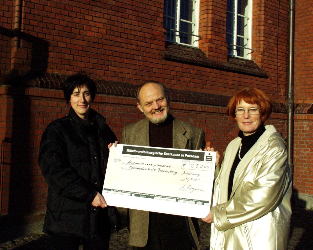 Die Fachhochschule Brandenburg (FHB) hat ein vorgezogenes Weihnachtsgeschenk erhalten: Ein Privatmann spendete der Hochschule 25.000 Euro. Dieses Geld wird je zur Hälfte der Hochschulbibliothek und dem Akademischen Auslandsamt zur Verfügung gestellt. Mit einem symbolischen Scheck übergab FHB-Präsident Prof. Dr. Rainer Janisch den Leiterinnen der Einrichtungen, Dr. Birgit Zänker (Bibliothek) und Dr. Claudia Appelius (Auslandsamt), die Spendengelder.