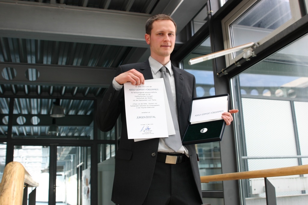 Jürgen Dostal, Absolvent des Studiengangs Druck- und Medientechnologie, hat den erstmals ausgelobten Adolf I. Döpfert-Stiftungspreis für herausragende Diplomarbeiten erhalten. Dostal hat sein Studium an der Hochschule der Medien (HdM) im Wintersemester 2003/2004 abgeschlossen und sich in seiner Diplomarbeit mit dem Drucken von funktionalen Schichten für Einsatzgebiete in der Polymerelektronik beschäftigt. Die Arbeit entstand in Zusammenarbeit mit der Siemens AG, Erlangen, und wurde von HdM-Professor Dr. Gunter Hübner betreut. Der mit 2500 Euro dotierte Adolf I.Döpfert-Stiftungspreis wurde am 4. März 2004 in einer Feierstunde übergeben.