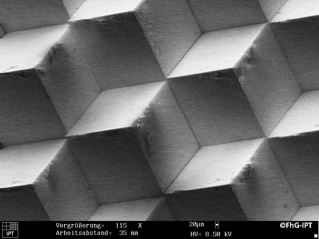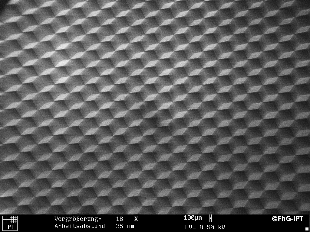 Für diese und zahlreiche weitere Anwendungen mit besonders hohem Anspruch an die Reflexionswerte entwickelte das Fraunhofer-Institut für Produktionstechnologie IPT zusammen mit der ULTRA REFLEX GmbH aus Renchen eine neue hochpräzise Reflektorstruktur. Die sogenannte Tripelarray-Struktur (siehe Abbildung), die in dem gemeinsamen Entwicklungsprojekt aufgebaut wurde, basiert auf ultrapräzise bearbeiteten und hochgenau montierten Messingblättchen. Die fertige Struktur dient bei der Herstellung der eigentlichen Reflektoren als Werkzeugmaster, von dem das endgültige Werkzeug aus chemisch abgeschiedenem Nickel abgeformt wird. Das so entstandene Werkzeug kommt dann beim Spritzguss der Reflektoren aus PMMA ("Acrylglas") zum Einsatz.