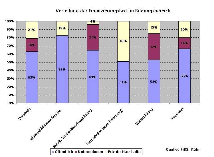 In einer Studie zur technologischen Leistungsfähigkeit Deutschlands, die das Forschungsinstitut für Bildungs- und Sozialökonomie (FiBS) im Auftrag des Bundesministeriums für Bildung und Forschung durchgeführt hat, werden die gesamten öffentlichen und privaten Ausgaben für Bildungsaktivitäten betrachtet. Wenn das durchschnittliche Bildungsniveau in Deutschland angehoben werden soll, bedarf es einer weitgehenden Neuverteilung der Finanzlasten zwischen den öffentlichen und privaten Haushalten.