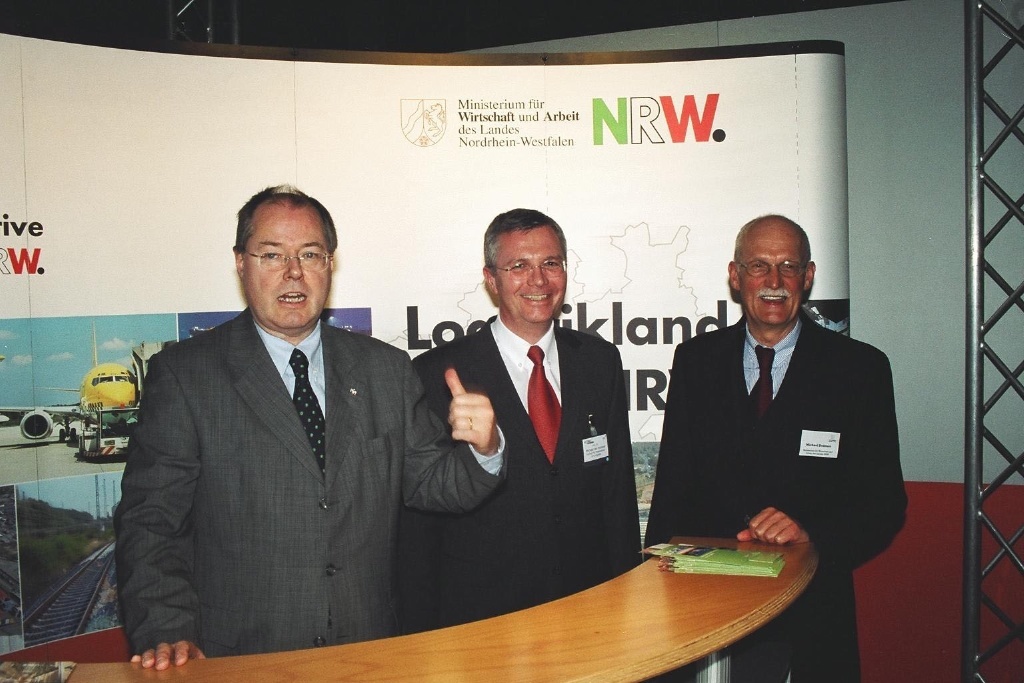 Nahmen Prof. Michael ten Hompel bedeutungsvoll in die Mitte: Ministerpräsident Peer Steinbrück und Ministerialdirigent Michael Deitmers, NRW-Wirtschaftsministerium.