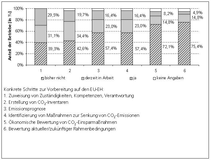 Entsprechend halbherzig wurden bisher die Vorbereitungen auf den Emissionshandel betrieben. Selbst von den Unternehmen, die über ihre Teilnahmeverpflichtung sicher Bescheid wissen, hat erst ein Drittel geklärt, welche Personen für das Thema im Unternehmen zuständig sind. Lediglich 18 Prozent der Unternehmen kannten ihren voraussichtlichen Kohlendioxid-Ausstoß und nur zehn Prozent hatten über Maßnahmen zur Emissionsminderung nachgedacht. Insbesondere kleine und mittelständische Unternehmen hinken bei der Umsetzung hinterher.