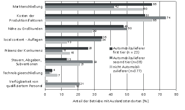 Ein vieldiskutierter Ausweg sind Produktionsverlagerungen ins Ausland. Doch diese sind hauptsächlich für Systemlieferanten geeignet, die ganze Baugruppen direkt an die Automobilhersteller liefern. Diese so genannten first tier supplier müssen weltweit in der Nähe ihrer Kunden produzieren oder wollen neue Märkte erschließen - Strategien, bei denen ein Engagement im Ausland wichtig ist. Fast die Hälfte dieser Unternehmen hat daher schon eine Auslandsproduktion aufgebaut.