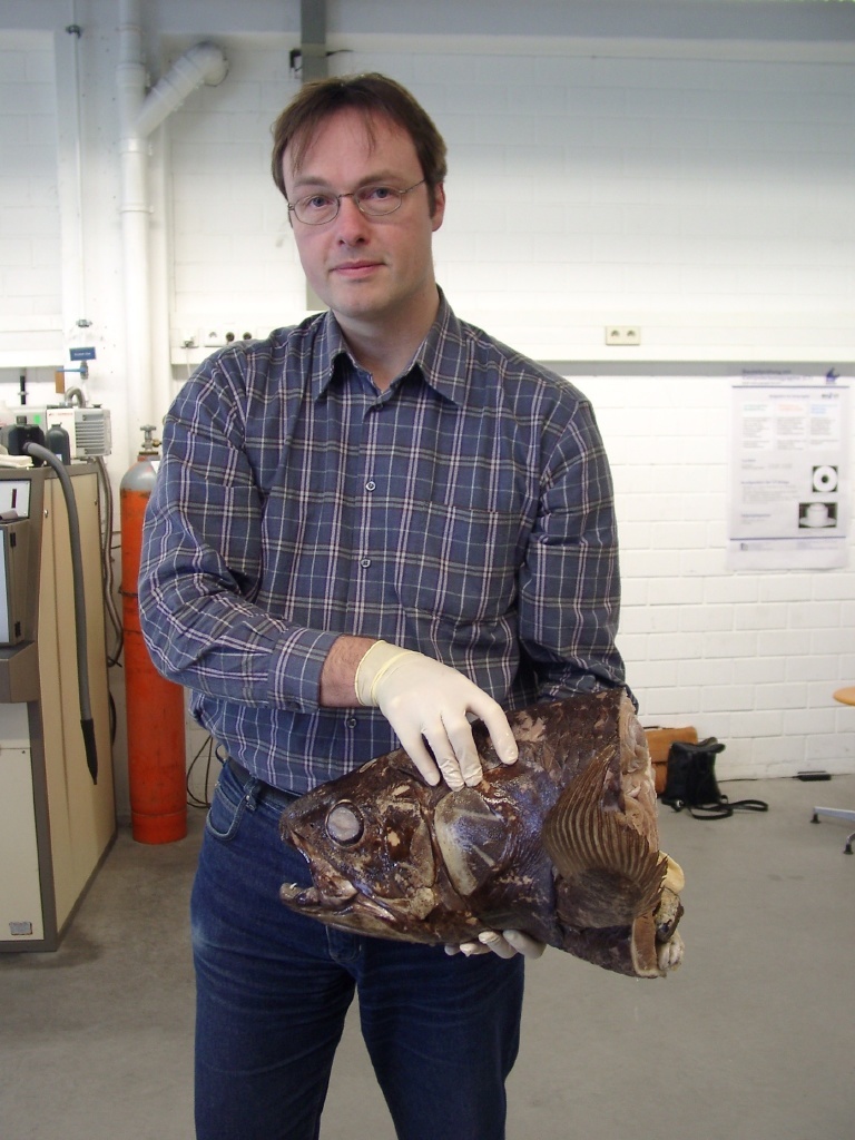 Der Quastenflosser galt als ausgestorben, bis im Jahre 1938 vor der Küste Südafrikas ein lebendes Tier gefangen wurde. Der tot Geglaubte ist ein Fisch, der vor der Inselgruppe der Komoren zwischen der Nordspitze Madagaskars und der Ostküste Afrikas in 200 bis 700 Meter Tiefe in geringer Anzahl anzutreffen ist. Er wird bis zu 180 Zentimeter groß und bringt rund 100 Kilogramm auf die Waage. Der Quastenflosser steht unter höchstem Artenschutz und darf nur kontrolliert zu Forschungszwecken gefangen werden. Etwa 200 Exemplare sind auf die Forschungseinrichtungen weltweit verteilt, schätzt Dr. Peter Bernstein vom Institut für Spezielle Zoologie der Universität Tübingen. Der promovierte Morphologe brachte den Kopf eines Quastenflossers an die Fachhochschule Aalen, um das "ausgesprochen wertvolle Exemplar" im Labor von Prof. Dr. Dr. Friedrich Klein computertomographisch durchleuchten zu lassen.