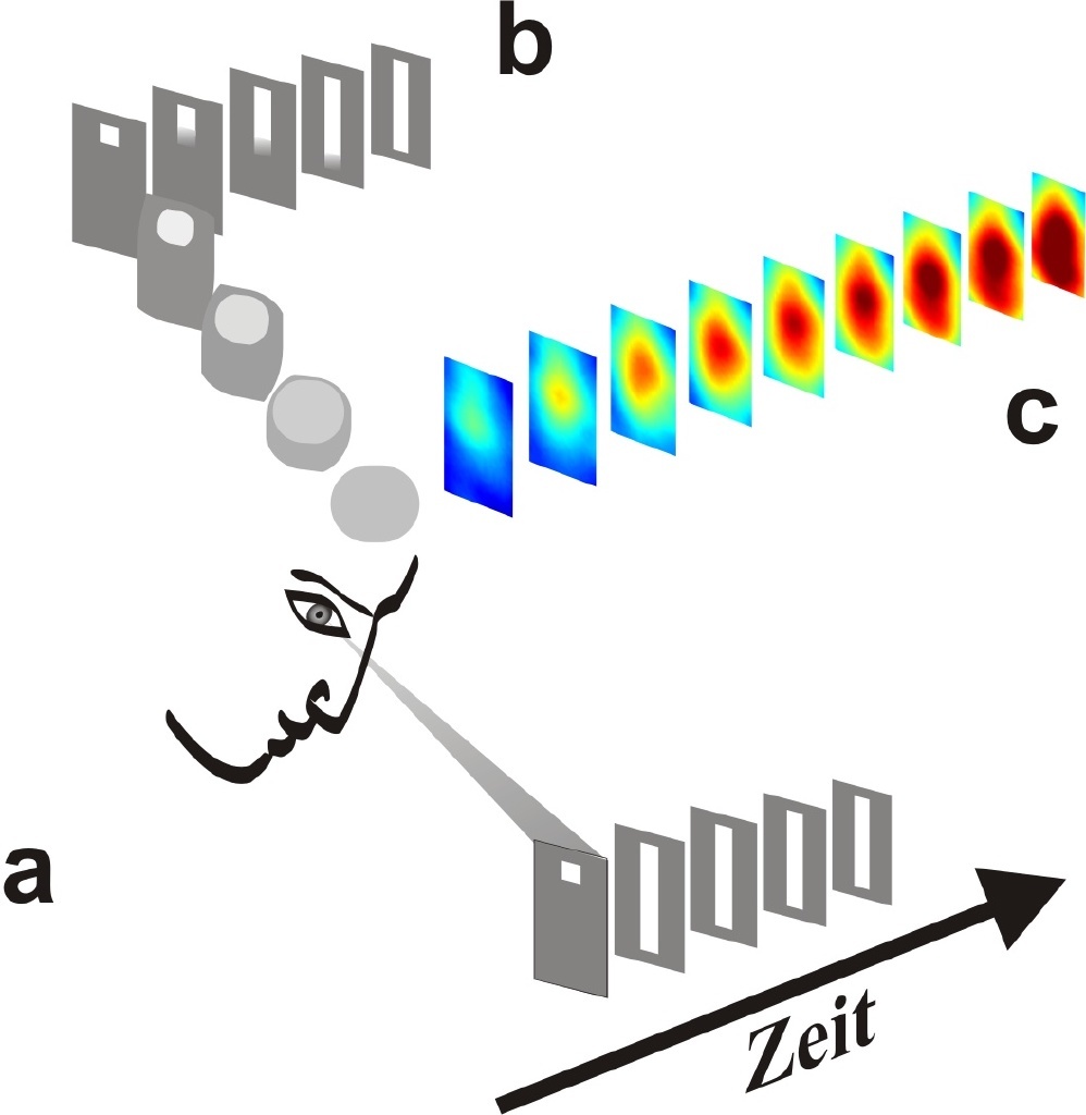 Auf einem Monitor leuchtet kurz ein Lichtpunkt auf, gefolgt von einem balkenförmigen Lichtreiz (s. Abb., a - Zeit). Diese einfache Anordnung wird jedoch anders wahrgenommen: Der Balken scheint sich vom Ort des Lichtpunktes auszudehnen und eine Bewegung vorzutäuschen (s. Abb., b). Auf die Gehirnoberfläche geblickt, werden unterschiedliche Aktivitätszustände farblich dargestellt (s. Abb., c). Jedes Bild ist eine Momentaufnahme von 10 Millisekunden Dauer, es zeigt jeweils einen etwa 7x3 mm großen Bereich, der Millionen von Nervenzellen umfasst. Die Farben kennzeichnen den momentanen Aktivitätszustand: Dunkelrote Bereiche beinhalten Nervenzellen mit überschwelliger Aktivität, - die innerhalb des Areals und an höhere Hirnareale weitergleitet wird -, während sich die von blau nach rot ansteigend gefärbten Gehirnbereiche in unterschwelligen Aktivitätszuständen befinden. Der überschwellige, dunkelrote Bereich entwickelt sich in die gleiche Richtung wie unsere Wahrnehmung. Es entsteht ein neuronales Korrelat der Illusion (s. Abb. b).