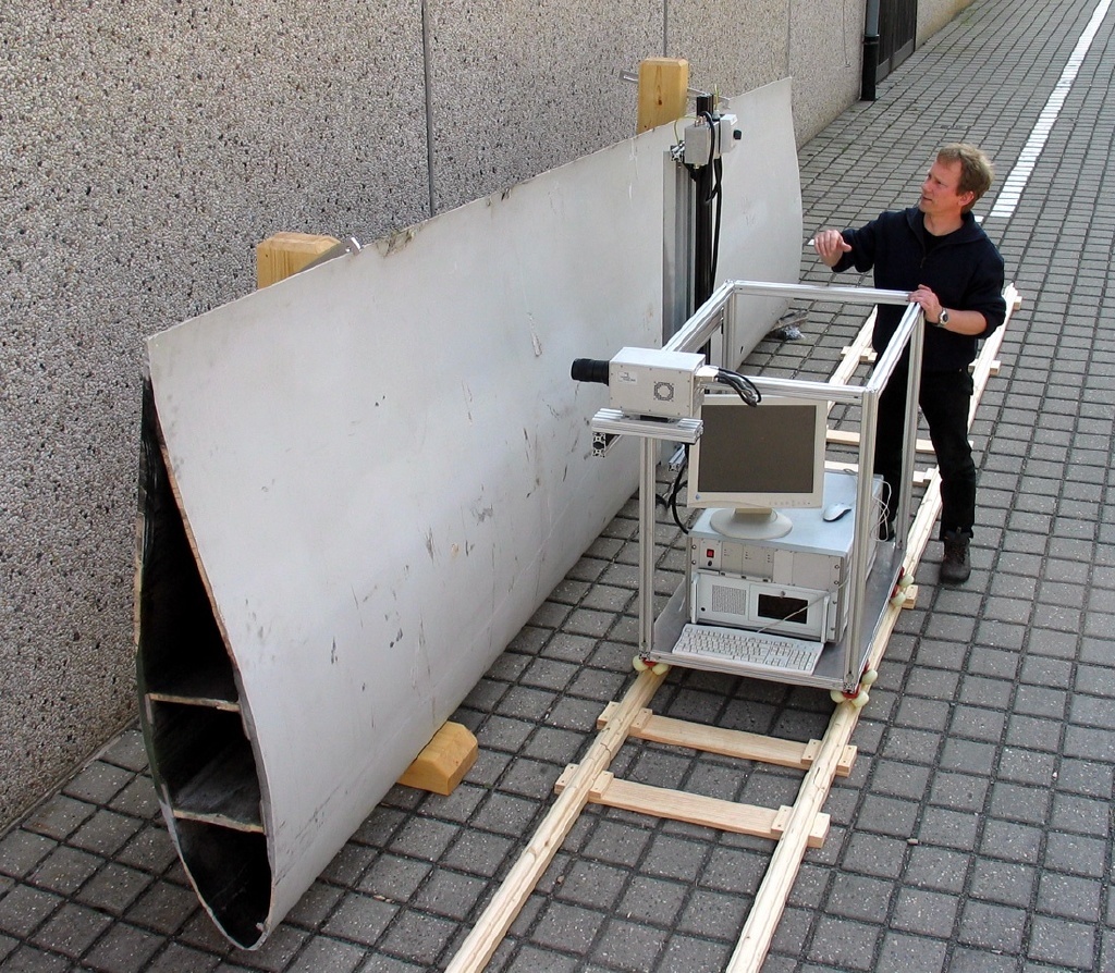Die zugrunde liegende Wärmeflussthermographie, die ursprünglich zur Qualitätskontrolle von Laminatfußböden entwickelt wurde, erläutert Peter Meinlschmidt, Physiker und Projektleiter am WKI: "Mit einem Heizstrahler, der auf einem rollenden Messwagen befestigt ist, erwärmen wir die Oberfläche des Rotorblattes oder die Tragfläche eines Segelflugzeugs. Kurz danach kommt eine Infrarotkamera, die das Wärmebild der Oberfläche filmt. Nachdem der Computer den Film ausgewertet hat, erkennen wir am Monitor Fehlstellen wie Blasen und andere Einschlüsse, Risse, Haftungs- und Klebefehler bis zu etwa einem Zentimeter Größe." Wesentlich dabei ist die dynamische Bildauswertung, denn es genügt nicht, einfach nur die Temperaturverteilung an der Oberfläche zu einem Zeitpunkt zu messen. Wärme neigt dazu, sich gleichmäßig zu verteilen. Auf dem Weg zu diesem Gleichgewichtszustand "verrät" sie Fehlstellen, die sich im Bauteil in bis zu einigen Zentimetern Tiefe "verstecken".