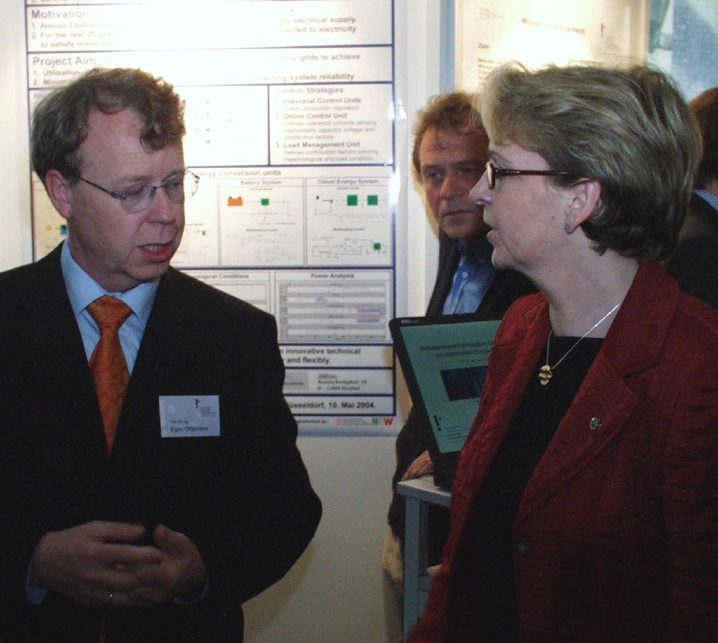 Der Soester Hochschullehrer präsentierte sein Forschungsprojekt "Multiskalierbares Hybridsystem für Inselnetze mit regenerativen Energiequellen" auf der Leistungsschau der NRW-Hochschulen, die gemeinsam vom Wissenschaftsministerium und der Arbeitsgemeinschaft industrieller Forschungsvereinigungen "Otto von Guericke" (AIF) in der Düsseldorfer Fachhochschule veranstaltet wurde. 13 NRW-Fachhochschulen stellten dort ihre aktuellen Forschungsergebnisse in einer Ausstellung interessierten Unternehmen vor. Alle Forschungsprojekte werden im Rahmen des Förderprogramms "Transferorientierte Forschung an Fachhochschulen in Nordrhein-Westfalen (TRAFO)" vom Wissenschaftsministerium finanziell gefördert. Die Veranstaltung wurde von Ministerin Hannelore Kraft eröffnet, die insbesondere den Beitrag der Fachhochschulen für den Wissenstransfer mit der Wirtschaft betonte: " Wir stellen nicht ohne Grund bis 2006 rund 14 Millionen Euro für TRAFO bereit. Fachhochschulen leisten einen wichtigen Beitrag zur Lösung praxisbezogener Problemstellungen und sind Partner für die regionalen Unternehmen. Dies unterstütze ich vehement, denn wir müssen möglichst viele Brücken bauen, um Wissenschaftler und Unternehmen zusammen zu bringen. Dies ist einer der Zukunftsschlüssel für die Innovationsfähigkeit unseres Landes."