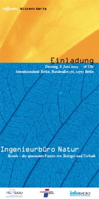 Die TSB Technologiestiftung Berlin, Investitionsbank Berlin und infoRADIO Berlin-Brandenburg laden Sie herzlich zur Talkrunde Treffpunkt WissensWerte "Ingenieurbüro Natur" am 8. Juni 2004 ein.