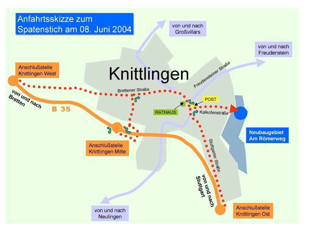 Zum Spatenstich am Dienstag, den 8. Juni 2004 um 11.00 Uhr in Knittlingen, Kalkofenstraße, werden neben allen Projektpartnern auch Vertreter des BMBF, des Projektträgers Wassertechnologie Karlsruhe und des Ministeriums für Umwelt und Verkehr Baden-Württemberg erwartet. Nach Ansprachen des Bürgermeisters, der politischen Prominenz und der Projektleiter wird eine letzte Ackerfurche gezogen. Mit Aktionen und Präsentationen werden Gäste und Pressevertreter über DEUS 21 informiert, für das leibliche Wohl ist selbstverständlich gesorgt.