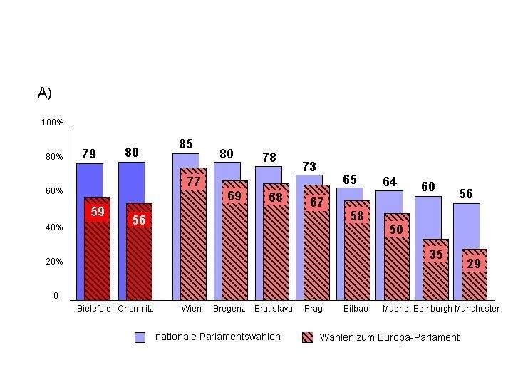An den letzten Europawahlen 1999 hat sich nur jeder Dritte der 18- bis 25-jährigen Deutschen beteiligt. Zwar behauptet die Mehrheit der befragten Jugendlichen, sich an kommenden Europawahlen beteiligen zu wollen; im Vergleich zu den nationalen Wahlen ist diese Bereitschaft jedoch eher gering. Ungefähr jeder vierte Befragte, der bei der Bundestagswahl noch seine Stimme abgeben würde, verweigert die Teilnahme an Europawahlen. Auch im internationalen Vergleich schneiden die beiden deutschen Städte unterdurchschnittlich ab; nur in Madrid, Edinburgh und Manchester fällt die Wahlbereitschaft unter jungen Erwachsenen noch geringer aus (vergl. Abb. A).