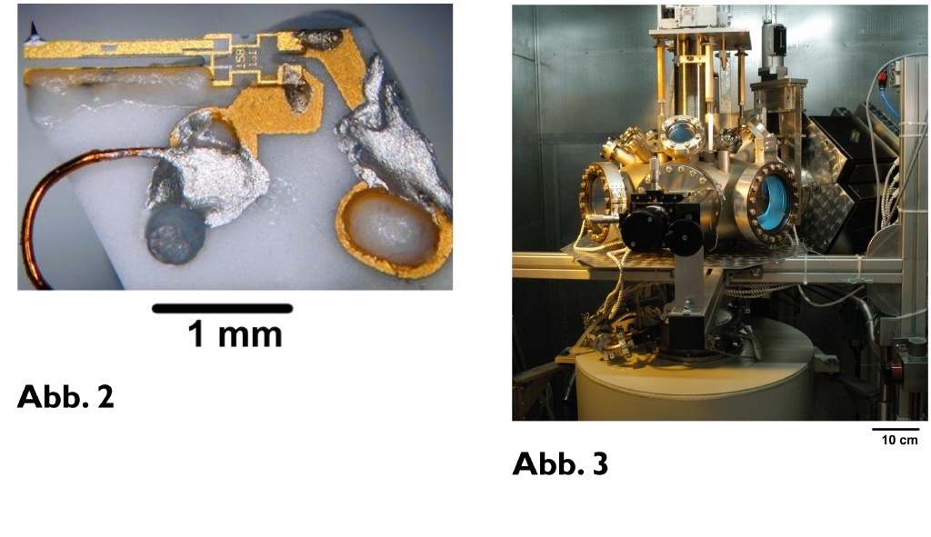 Das Experiment wurde in einem neuartigen Mikroskop (Abbildung 3) durchgeführt, das auf eine Temperatur von nur 5 Grad über dem absoluten Temperaturnullpunkt abgekühlt ist. Außerdem arbeitet das Instrument im Ultrahochvakuum mit einem Druck von etwa 1x10^-13 einer Atmosphäre. Das Mikroskop ist auf ein 30 t schweres Fundament gebaut und von externen Störungen wie etwa Schall und elektromagnetischen Störfeldern durch eine metallische Schallschutzkammer isoliert. Der Aufbau dieses Mikroskops am Institut für Physik der Universität Augsburg wurde durch ein langfristiges gemeinsames Forschungsprojekt (EKM) des Freistaats Bayern und des Bundesministeriums für Bildung und Forschung mit einer Projektbetreuung durch das VDI gefördert.