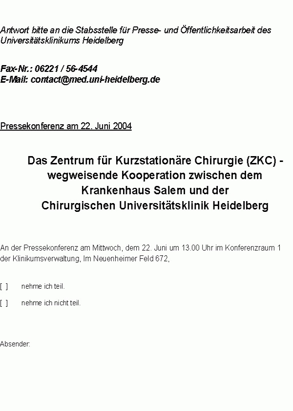 Der Umbau des Gesundheitswesens erfordert neue Wege und den Ausbau von Partnerschaften: Das Krankenhaus Salem, Heidelberg, und die Chirurgische Universitätsklinik Heidelberg haben in einer beispielhaften Kooperation das "Zentrum für Kurzstationäre Chirurgie (ZKC)" gegründet. Seit dem 1. April 2004 operieren und behandeln Ärzte der Chirurgischen Universitätsklinik mehrmals wöchentlich Patienten im Krankenhaus Salem, das für Pflege und Versorgung der Patienten zuständig ist. Bei den Operationen handelt es sich um Standardeingriffe, z.B. an Schilddrüse, Gallenblase, Magen-Darm oder um Leistenbruch-Operationen, die meist nur eine kurze stationäre Behandlung erfordern.