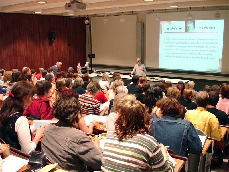 Nach den beiden Hauptvorträgen bot der Schweizer Dyslexieverband den rund 800 Teilnehmern noch ein breites Rahmenprogramm aus Einzelworkshops. Darunter waren u. a. auch zwei Workshops von Dr. Franz Karig "Lesen und Rechtschreiben lernen - Ein neuer Weg zum Verständnis von LRS: der NLP-Ansatz nach R. DILTS" sowie von Fred Warnke über "LRS-Therapieresistenz - Ursachen- statt Symptomarbeit". Letzterer Workshop wurde zweimal mit je rund 180 Teilnehmern durchgeführt; rund die Hälfte der Teilnehmer konnte sich auf diesem Wege einen guten Eindruck von den Vorteilen des ursachen-orientierten Trainings mit dem Warnke-Verfahren verschaffen.