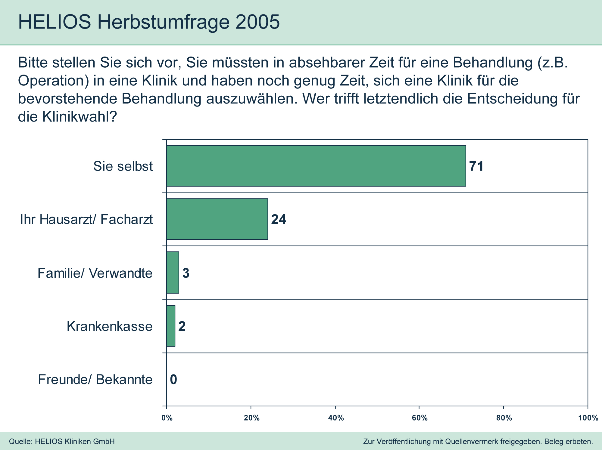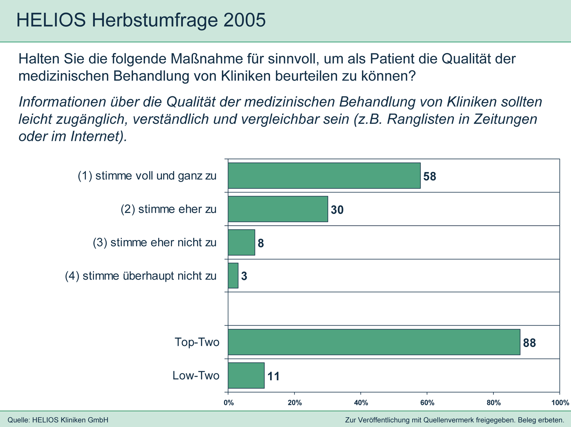 Die "HELIOS Herbstumfrage 2005" deckt die Bedürfnisse und Einstellungen der deutschen Bevölkerung in Bezug auf medizinische Qualität und Leistungstransparenz in Krankenhäusern auf. Seit September 2005 sind alle deutschen Krankenhäuser verpflichtet, Qualitätsberichte zu veröffentlichen.
