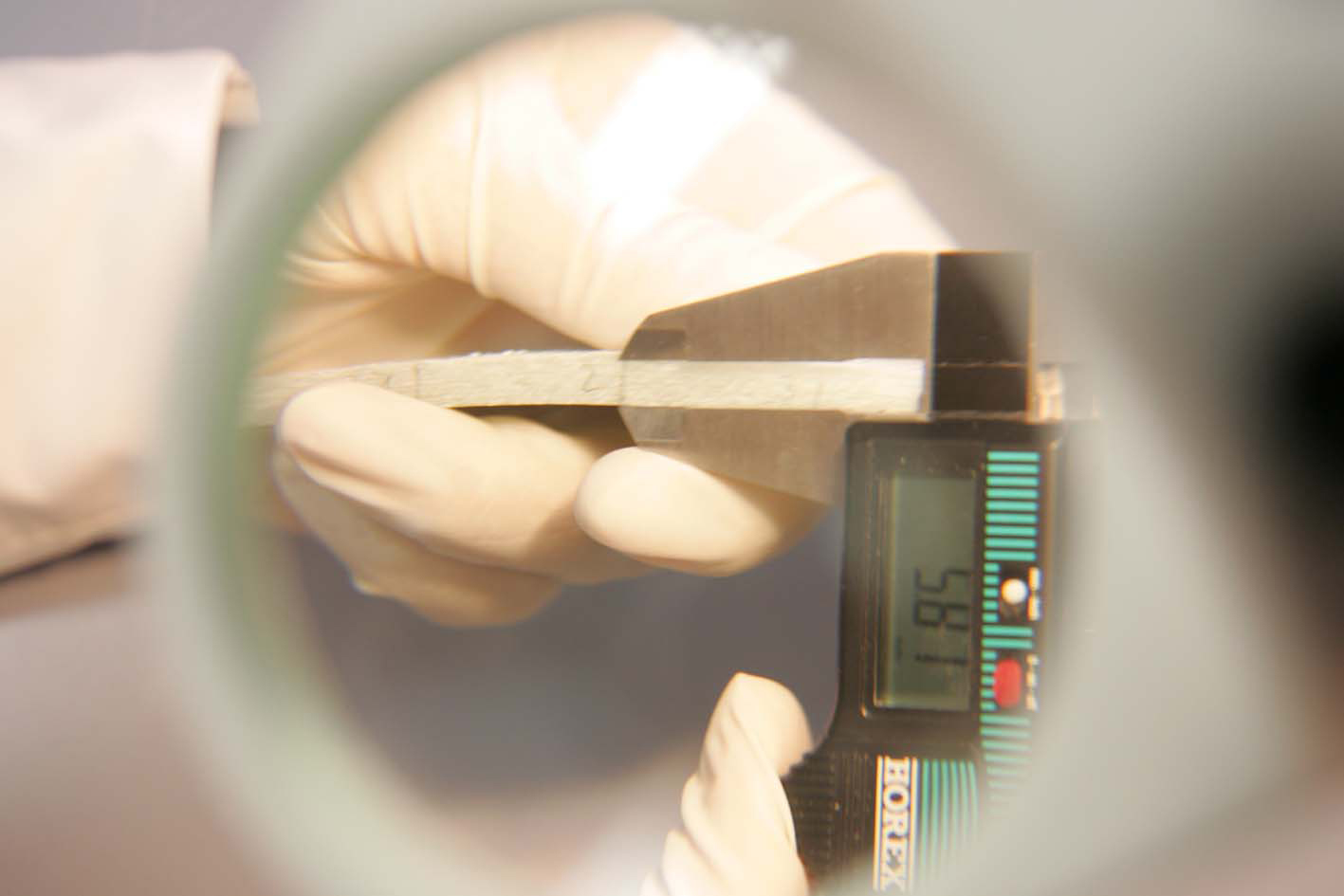 Das dritte für die Beurteilung der Liner-Tragfähigkeit relevante Kriterium ist die Wanddicke. Auch für sie wird z.B. in der statischen Berechnung eine Annahme getroffen, die später, bei der Herstellung des Liners auf der Baustelle, erreicht werden muss. Prüfmethode: Mit einer Präzisionsschieblehre wird die statisch tragfähige Wanddicke an sechs Stellen gemessen. Innen- und Außenfolien sowie Überschussharz werden dabei nicht berücksichtigt.