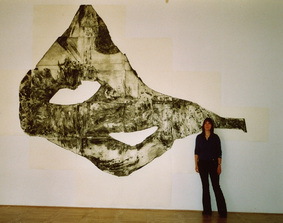 Die großformatigen, 2 bis 6 m großen Kartondrucke von Katrin König entstehen mit einer speziellen Technik. Aus Pappe sägt sie Formen heraus, die auf ganz unterschiedliche Weise vom Einritzen mit dem Messer bis zur Strukturierung mit Marmormehl, Quark oder Sand behandelt und anschließend mit einer Tiefdruckpresse gedruckt werden. Die so entstandenen Blätter setzt sie wie eine Art Puzzle direkt auf der Wand zusammen. Die in der jetzigen Ausstellung im IFW gezeigten Arbeiten kommen zum Teil ganz frisch aus der Druckerpresse, andere sind Teile ihrer Diplomarbeit.