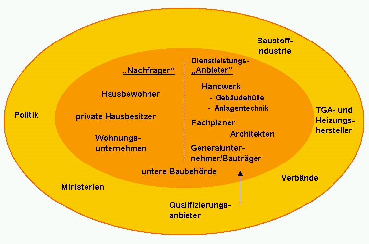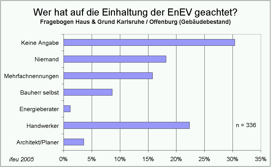 In der Studie wurden sowohl die Angebotsseite (Ministerien, Bauämter, Architekten, Ingeniere, Handwerker, Hersteller) als auch die Nachfrageseite über die Erfahrungen mit der EnEV im Wohnungsneubau und -bestand befragt. Zunächst erfolgte eine Bestandsaufnahme der unterschiedlichen Vollzugsregelungen in den einzelnen Bundesländern. Die Deregulierungsbemühungen im Rahmen der EnEV haben dazu geführt, dass auf behördliche Prüfungen der Nachweise und Energiebedarfsausweise sowie auf behördliche Kontrollen der Bauausführung weitgehend verzichtet wird. Die Befragungen der Akteure am Bau ergab, dass die Verlagerung der Verantwortung auf die privatrechtliche Seite nicht als ausreichend für die Einhaltung der EnEV angesehen wird. So wurde häufig angemerkt, dass das jetzige System auf Grund der fehlenden Kontrolle Fehlentwicklungen begünstigt, da Marktakteure, die die Regelungen nicht einhalten, kaum mit Konsequenzen rechnen müssen.