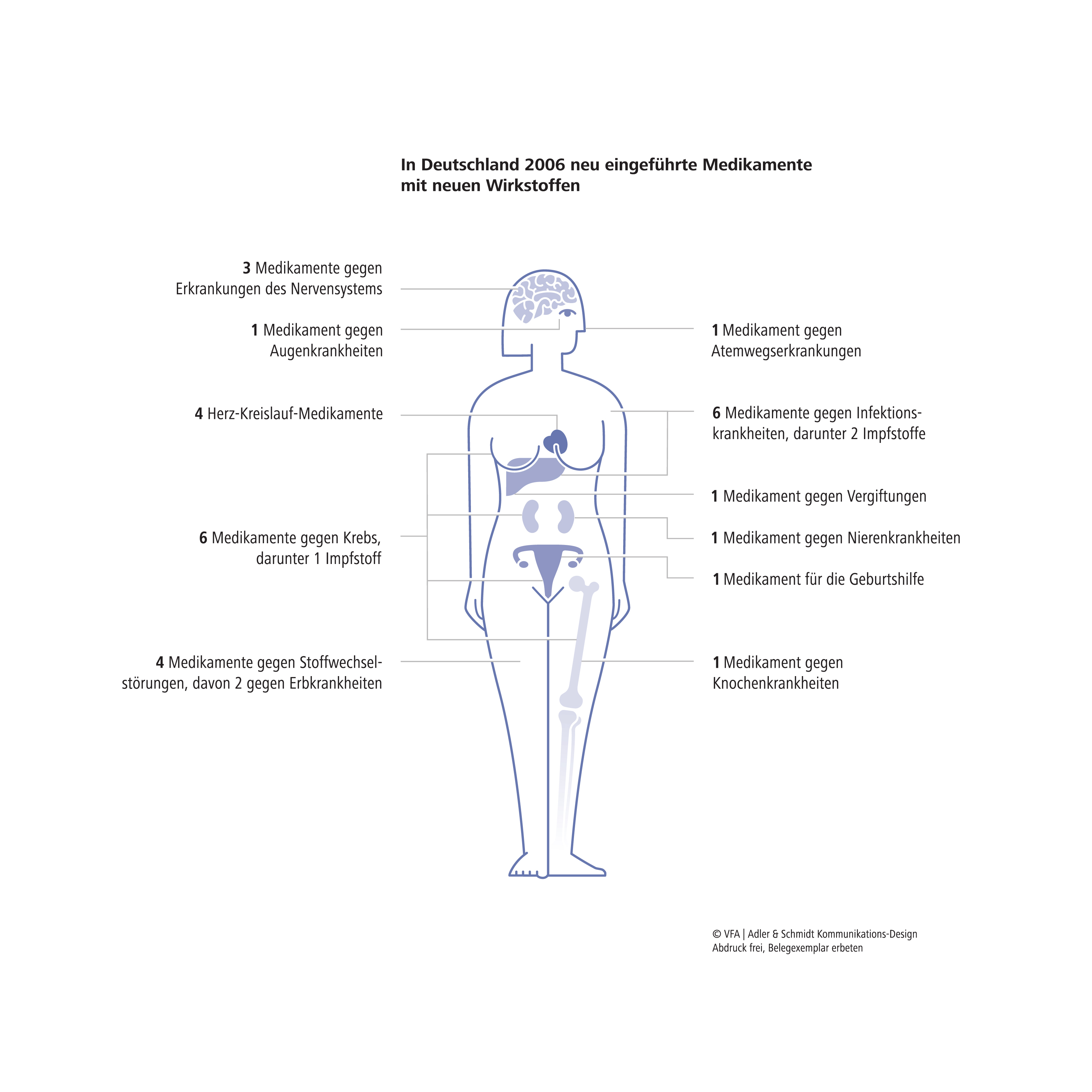 2006 haben neuartige Medikamente große Fortschritte in der Medizin ermöglicht. So können beispielsweise erstmals Mädchen und Frauen dem Gebärmutterhalskrebs mit einer Impfung vorbeugen. Patienten mit Nierenzellkrebs oder der chronischen Leberentzündung Hepatitis B lassen sich weitaus wirksamer behandelt als zuvor. Zwei neuartige Antibiotika machen Bakterien unschädlich, die gegen andere Präparate bereits resistent geworden sind. Patienten mit den seltenen Erbkrankheiten Morbus Pompe und Mucopolysaccharidose VI können erstmals wirksam behandelt werden. Kinder profitieren beispielsweise von Impfstoffen gegen Brechdurchfall und einem neuen Leukämiemedikament. Im ganzen haben forschende Pharmaunternehmen im vergangenen Jahr 29 Medikamente mit neuen Wirkstoffen auf den Markt gebracht, dazu noch 19 Präparate, mit denen sich bekannte Wirkstoffe auf neue Art - und damit oft wirkungsvoller - verabreichen lassen.