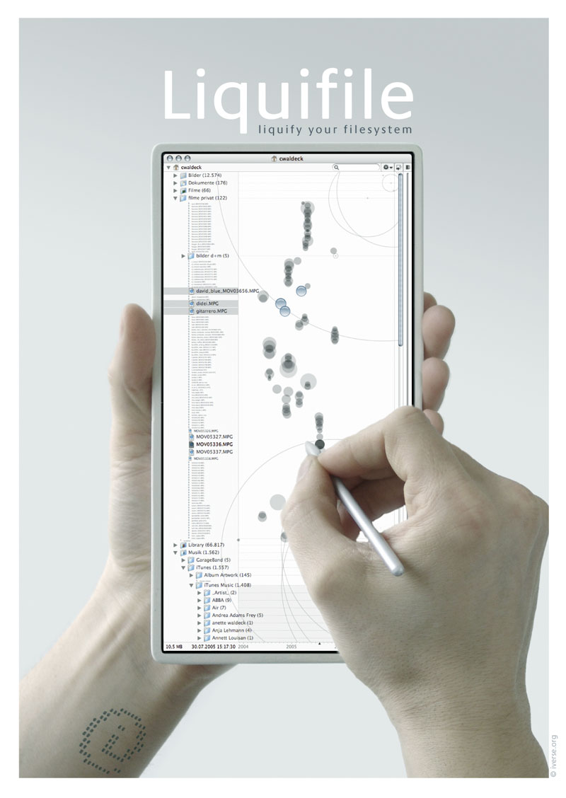 Ein auf Liquid Browsing basierender visueller Dateibrowser, der erstmals Suchen und Navigieren vollständig in einem Interface vereint - das ist Liquifile. Für den Nutzer bedeutet dies vor allem eins: Er findet selbst Dateien, an deren Namen und genauen Speicherort er sich nicht erinnern kann, schnell und einfach wieder. Die graphische Visualisierung von Metadaten sowie ein gezieltes Ein- und Ausblenden der Datenstruktur bieten zusätzlich Unterstützung bei der Arbeit mit den Dateien. Entwickelt hat das System das junge Darmstädter Software-Unternehmen iVerse. Die erste Version der Software steht unter