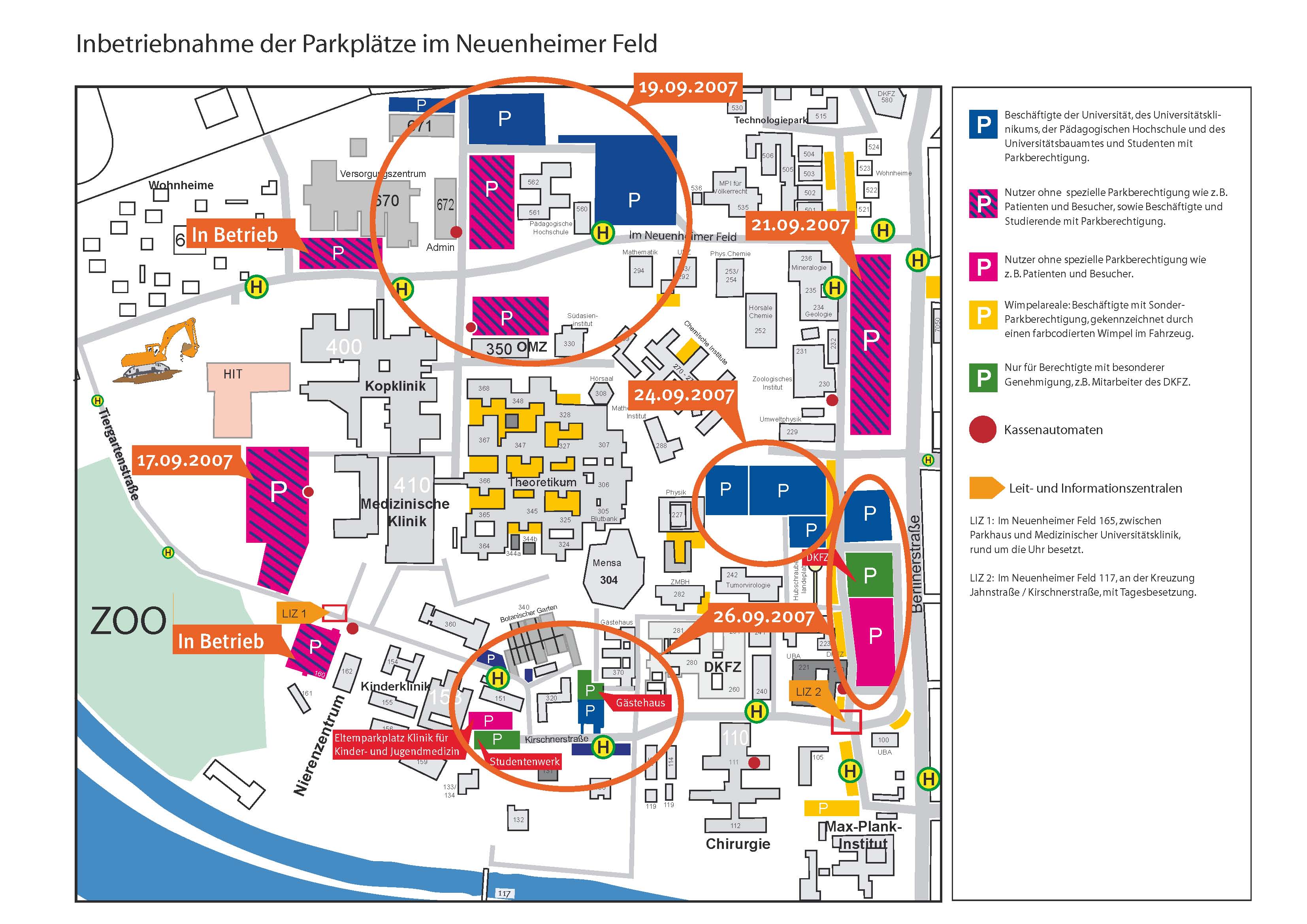 Ab Montag, dem 17. September 2007, wird Im Neuenheimer Feld die Parkraumtechnik für die insgesamt rund 4.000 Parkplätze des Universitätsklinikums, der Universität, der Pädagogischen Hochschule und des Universitätsbauamts Heidelberg probeweise in Betrieb genommen.