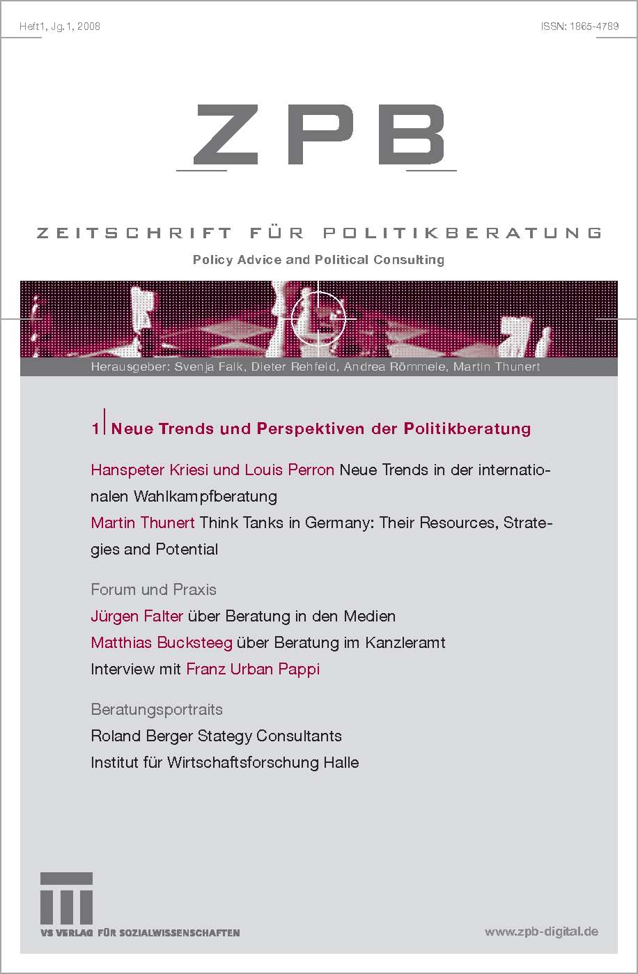 Diesem weiten Themenfeld widmet sich die neue ZPB (Zeitschrift für Politikberatung), die ab April 2008 vierteljährlich im Verlag für Sozialwissenschaften (VS) in gedruckter Form und auch in einer online-Version erscheinen wird. Am 11. und 12. April wird die neue Zeitschrift in der Konrad-Adenauer-Stiftung und der Hertie School of Governance in Berlin vorgestellt werden.