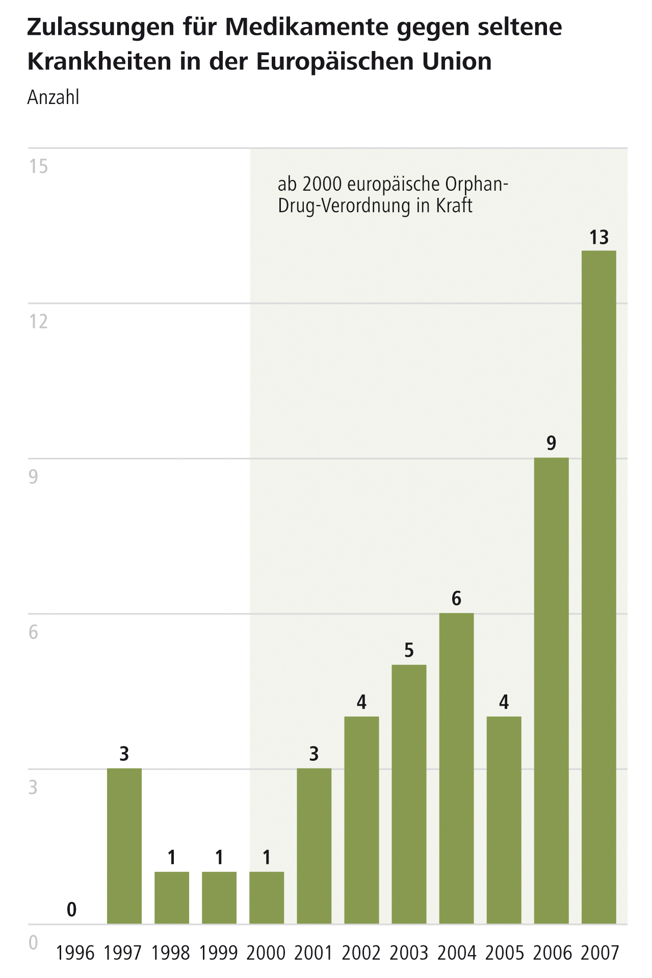Seit ihrer Verabschiedung im April 2000 hat die Verordnung bereits 44 Medikamenten gegen eine seltene Krankheit zur Entwicklung und Zulassung verholfen. Vor 2000 kam pro Jahr im Schnitt nur ein solches Medikament heraus.