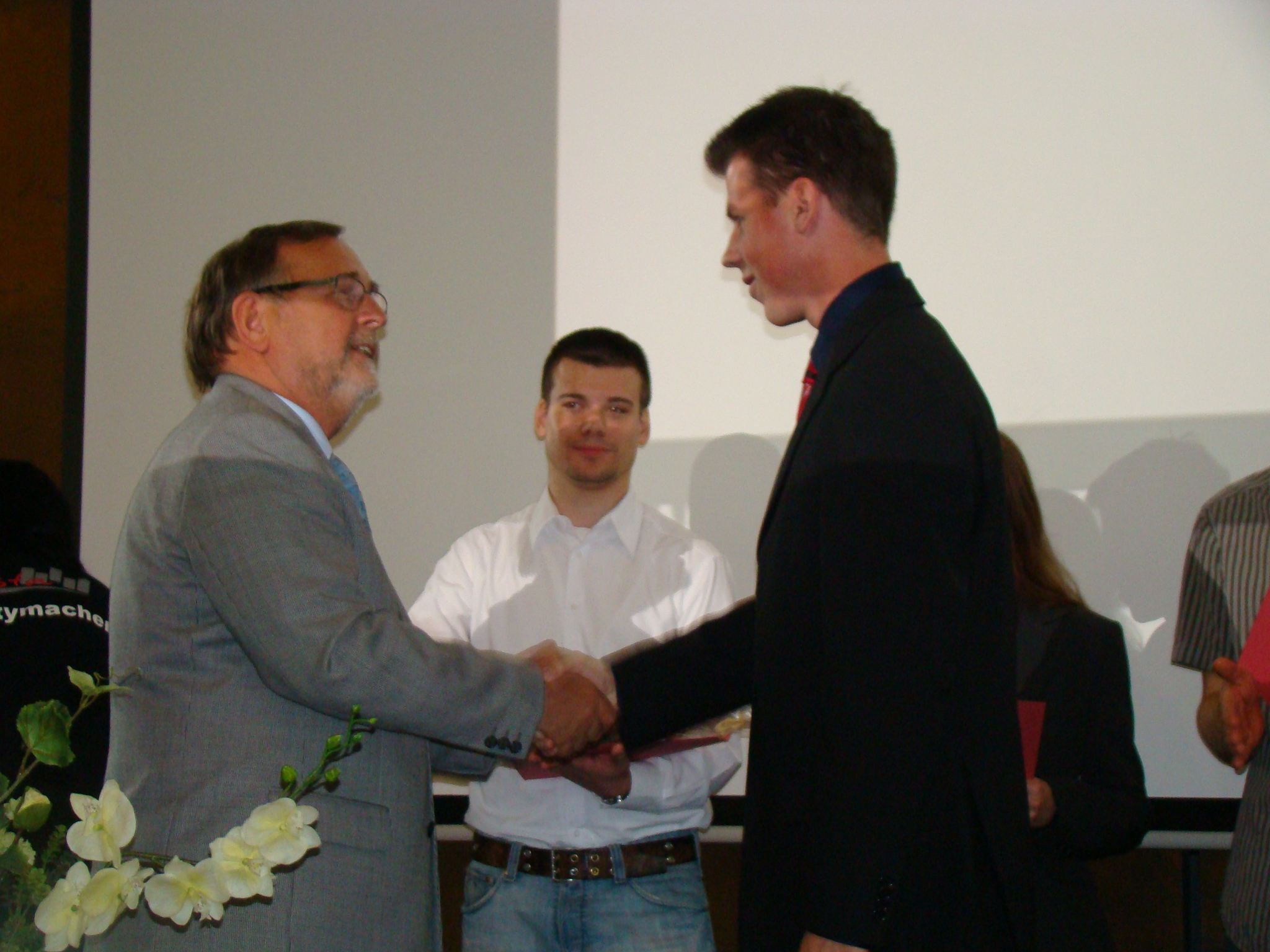 Im Rahmen der Immatrikulationsfeier werden traditionell auch die besten Absolventen der vergangenen 12 Monate geehrt. Aus den Händen von Klaus Windeck von der Gesellschaft der Freunde der Fachhochschule Brandenburg erhielten die Folgenden eine Auszeichnung (Urkunde, Visitenkartentasche und Blume):