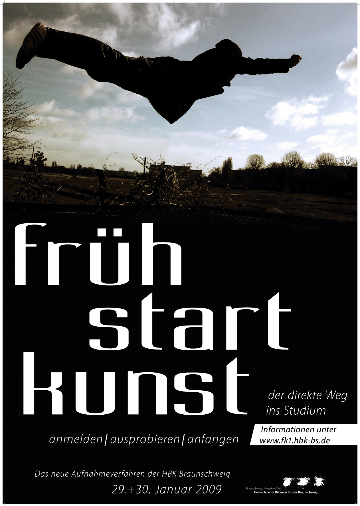 Die Anmeldung erfolgt ohne großen Aufwand per E-Mail bis zum 19.01.2009. Weitere Informationen zum "Frühstart" sowie zur Anmeldung finden Sie unter: http://fk1.hbk-bs.de/