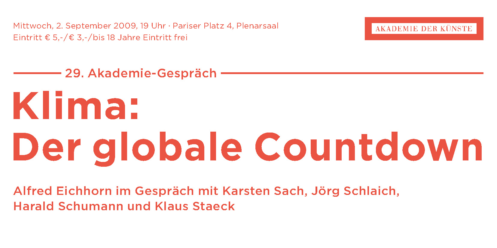 Im 29. Akademie-Gespräch am 2. September 2009 fragt die Akademie der Künste nach Wegen aus der Klimafalle. Politische sowie wissenschaftlich-technische Fragestellungen werden um die Perspektive der Kunst erweitert.