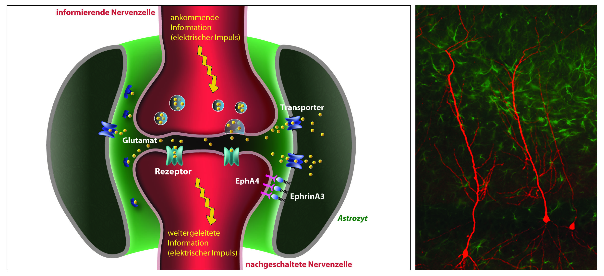 Dieser Kommunikation kamen die Neurobiologen auf die Spur, als sie das Signalmolekül EphrinA3 und seinen Bindungspartner, das EphA4, in Mäusen untersuchten. Ephrine und Eph-Rezeptoren sind häufig beteiligt, wenn sich Zellen gegenseitig erkennen oder beeinflussen. So fördern Astrozyten über EphrinA3/EphA4 auch die Reifung von Synapsen. "Völlig unerwartet war jedoch, dass es auch einen Einfluss in die andere Richtung gibt", so Klein. Fehlt der EphA4-Rezeptor in einer Nervenzelle, so bildet der benachbarte Astrozyt vermehrt Transporter aus. Diese saugen so viel Glutamat aus der betroffenen Synapse ab, dass diese nicht mehr verstärkt werden kann. Ein sicherer Nachteil beim Lernen.