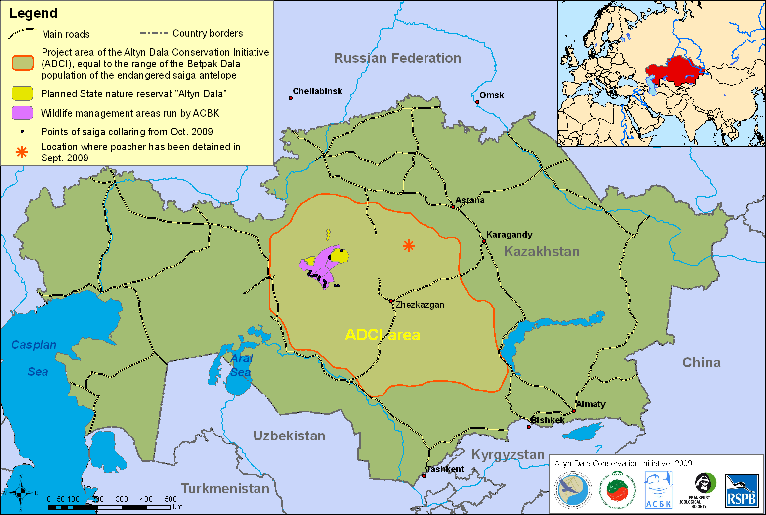 - Grafik: Karte des Altyn Dala Schutzgebietes und der Saiga-Populationen