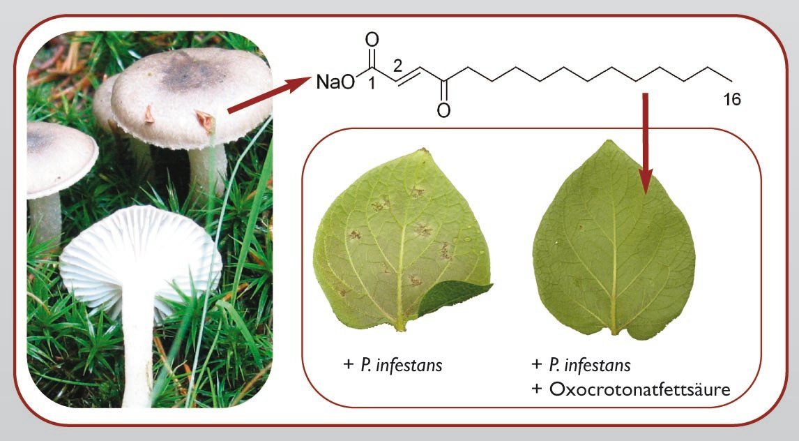 Das Ergebnis war vielversprechend. Die Biotests ergaben, dass Schnecklinge eine Vielzahl von antibiotischen Substanzen produzieren, die gegen Bakterien und parasitische Pilze aktiv sind. Die jüngst gefundenen Naturstoffe gehören zur Gruppe der Oxocrotonatfettsäuren und wirken gegen Oomyceten, zu denen Phytophthora gehört. Den Befunden zufolge, hemmen die Wirkstoffe in starkem Maße die Sporenkeimung aber auch das Myzelwachstum des Erregers. Dies wurde zunächst im Reagenzglas und später auch an Pflanzen demonstriert. So wie¬sen Kartoffelpflanzen, deren Blätter man mit einer bestimmten Menge an Oxocrotonatfettsäuren spritzte und anschließend mit Sporen von Phytophthora infizierte, keinerlei Krankheitszeichen der Kraut- und Knollenfäule auf. Auf die Pflanzen selbst hatte der Wirkstoff, auch in hohen Konzentrationen appliziert, keinen negativen Effekt.