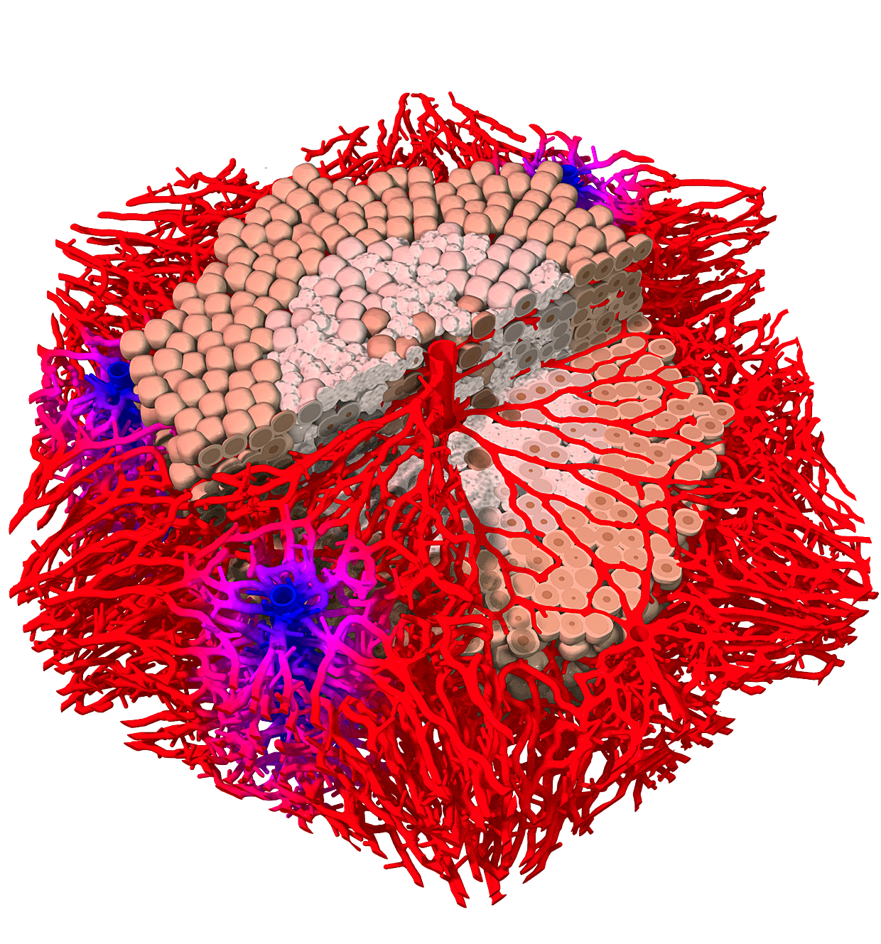 Die Leber ist ein ganz besonderes Organ: Selbst wenn sie – etwa nach Vergiftungen – zu mehr als fünfzig Prozent ihrer Gesamtmasse beschädigt ist, kann sie sich beinahe vollständig regenerieren. Diese Fähigkeit ist ebenso lebenswichtig wie erstaunlich. Die Leber ist das bedeutendste Stoffwechselorgan und hat unter anderem zur Aufgabe, das Blut zu entgiften. Damit sie dies leisten kann, ist sie mit einer höchst aufwändigen Anatomie ausgestattet: Beim Menschen setzten sich die beiden Leberlappen aus rund einer Million kleiner Leberläppchen von maximal einem bis zwei Millimetern Größe zusammen. Das in die Leber einströmende Blut tritt über das sogenannte Portalfeld, das benachbarte Leberläppchen voneinander trennt, in die Läppchen ein und fließt durch winzige Blutgefäße, die von Hepatozyten, dem häufigsten Zelltyp in der Leber, umgeben sind, zu einer zentral liegenden Vene, die das Blut wieder abführt. Diese spezielle Architektur stellt sicher, dass das Blut optimalen Kontakt zu den Hepatozyten hat, wenn es durch das Organ fließt.