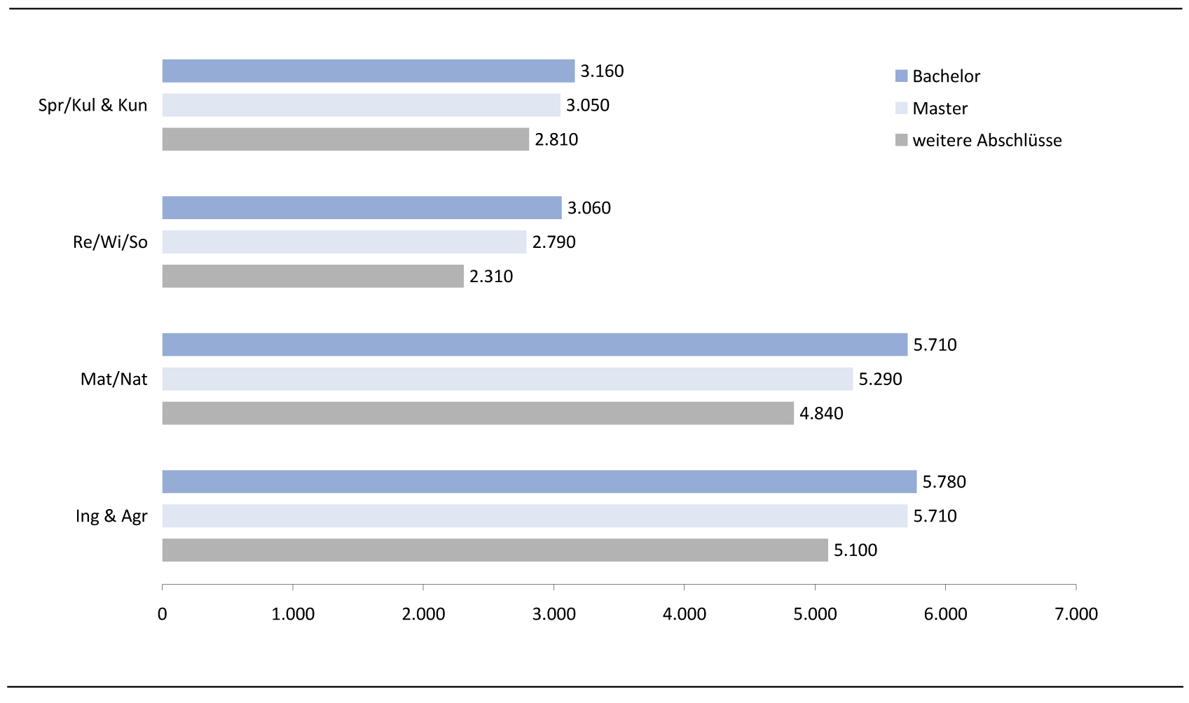 Im Vergleich der Fächergruppen wird deutlich, dass die Rechts-, Wirtschafts- und Sozialwissenschaften für alle Abschlusstypen die niedrigsten Studienplatzkosten aufweisen. Es folgen die Sprach- und Kulturwissenschaften einschließlich der Kunst und Kunstwissenschaften. Bei den neuen Abschlüssen ist der Abstand zwischen den beiden Fächergruppen allerdings deutlich geringer als bei den traditionellen Abschlüssen. Anders ausgedrückt: Es findet eine Annäherung der studienplatzbezogenen Lehrkosten statt. Ähnliches lässt sich für die Fächergruppe Mathematik, Naturwissenschaften beobachten, die bei den Lehrkosten je Bachelorstudienplatz mittlerweile fast das Niveau der Fächergruppen Ingenieur- und Agrarwissenschaften erreicht.