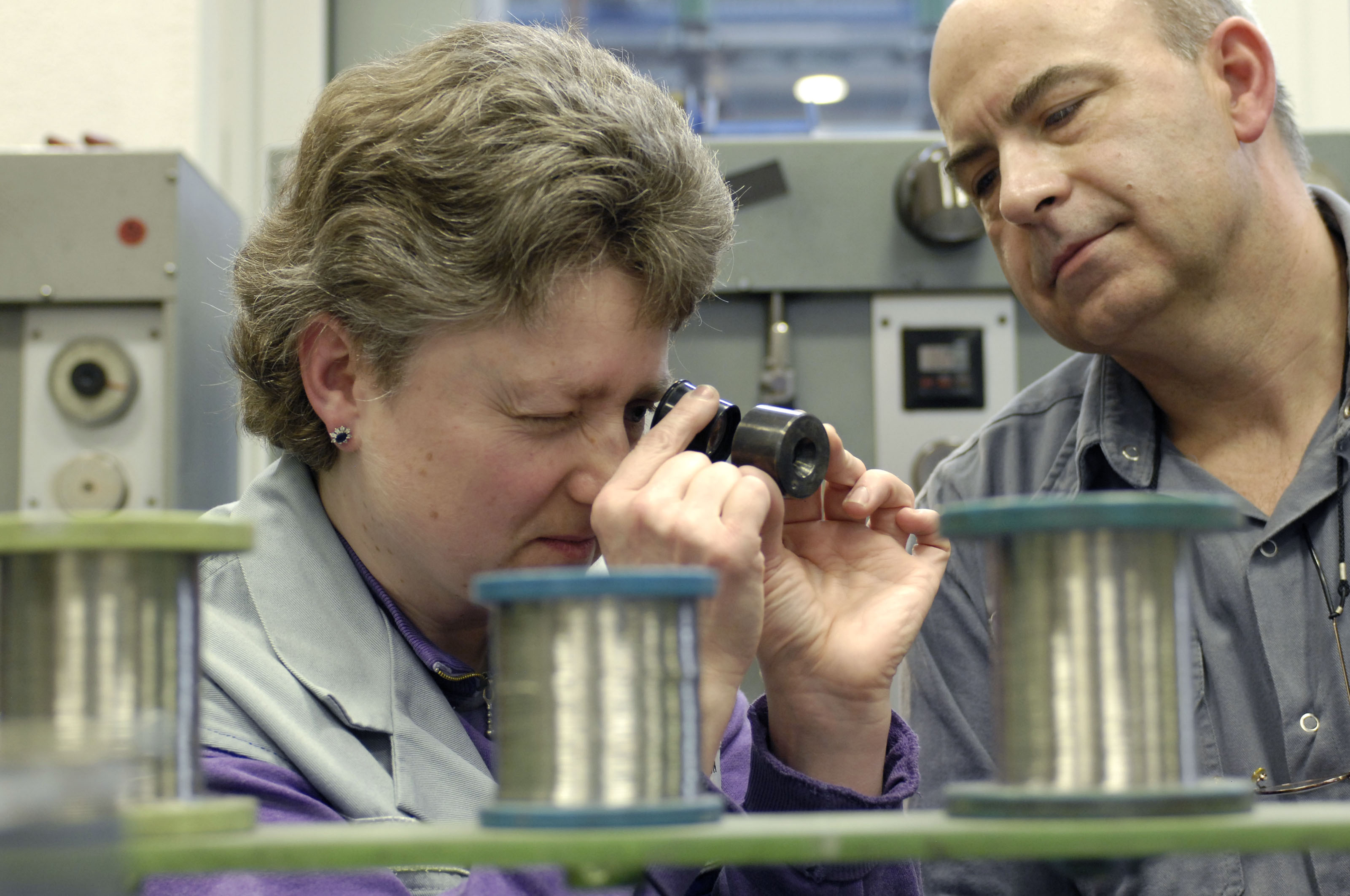 Ein Stein schafft es, viele Kilometer Draht zu ziehen - aber dann gibt selbst ein Diamant nach. An der Innenwand des Kegels bilden sich Unebenheiten - so genannte Ziehspuren - und an diesem Punkt kommt die Ziehsteinpoliererei ins Spiel. Hier werden die Steine so aufbereitet, dass sie wieder eine einwandfreie Innenwand haben und so erneut zum Einsatz in der Drahtfertigung kommen können. Die Aufbereitung der alten Steine, für die ein umfassendes Know-how erforderlich ist, ist wesentlich günstiger als der Neueinkauf. Am Mikroskop überprüfen Mitarbeiter die Öffnung jedes Ziehsteins aufs Genaueste. Mit einem Testdraht wird am Ende die Größe der Öffnung überprüft - wobei „Größe“ in diesem Fall ein relativer Ausdruck ist: Der Durchmesser reicht von 0,08 Millimetern für das Ziehen von Feindrähten bis zu 15 Millimetern. Ist der Kern so sehr beschädigt, dass die händische Behandlung nicht mehr ausreicht, kommt die Ultraschall-Bearbeitungsmaschine für Ziehsteine zum Einsatz, mit der auch große Spuren bearbeitet werden können.