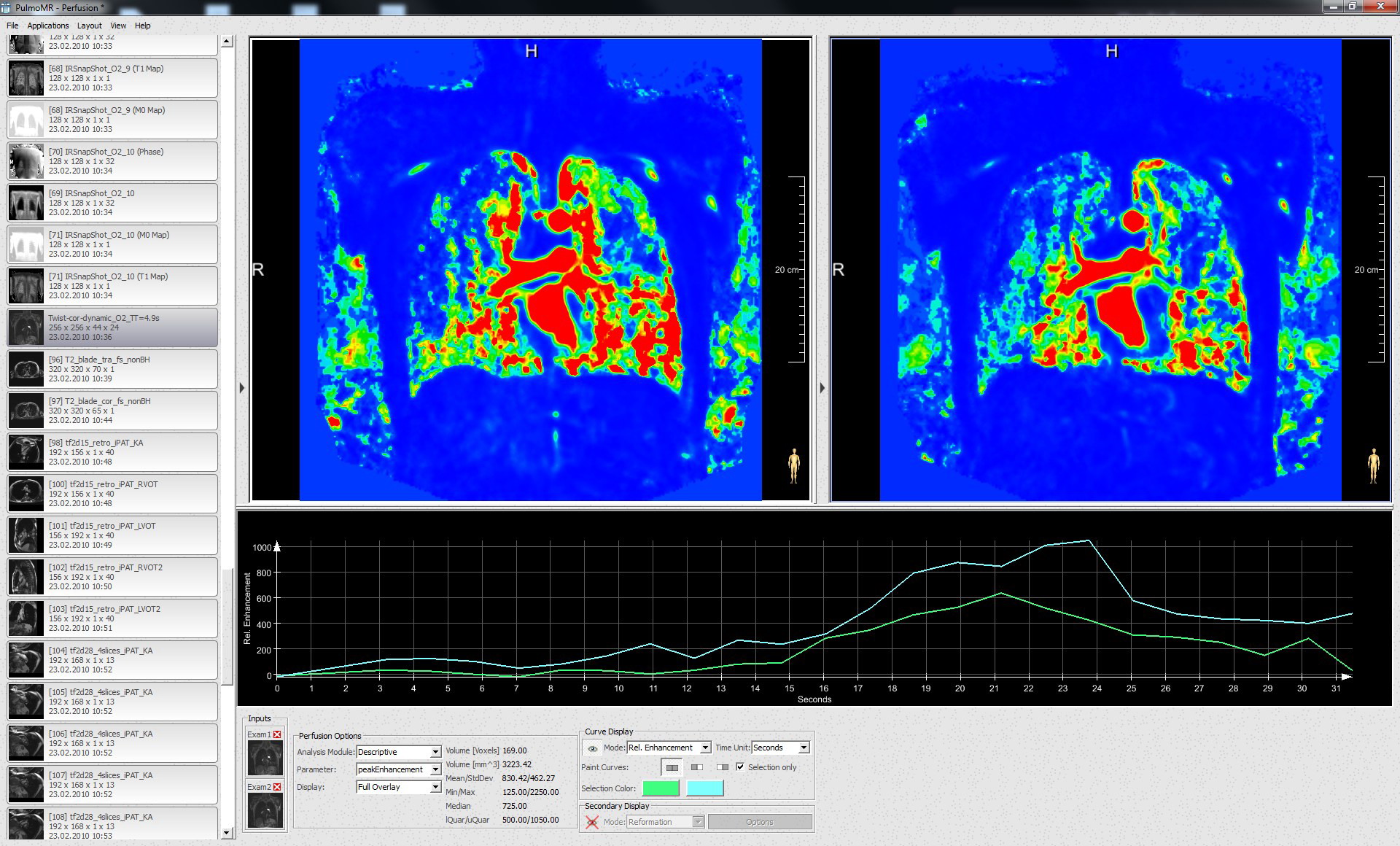 Um diese Bilder zuverlässig und mit konstanten Parametern zu analysieren, haben die Bremer Wissenschaftler nun eine Auswertungs-Software entwickelt. „Mit Hilfe unsere Softwareplattform PulmoMR sollen die Ergebnisse der MRT-Untersuchungen hinsichtlich Zuverlässigkeit, Genauigkeit und Reproduzierbarkeit optimiert werden“, betonte Dr. Peter Kohlmann von Fraunhofer MEVIS in seinem Vortrag. Vor allem die vielfältigen Anwendungsmöglichkeiten beeindruckten dabei die Zuhörer. Zum einen erlaubt die Software eine dezidierte Darstellung der Bilder: MRT-Daten welche mittels verschiedenster MR-Sequenzen aufgenommen wurden, können nebeneinander oder als überlagerte Bilder simultan und synchronisiert dargestellt werden. Darüber hinaus werden Verfahren entwickelt, um Bildartefakte, die durch natürliche Bewegungen wie beispielsweise Herzschlag und Atmung entstehen, zu minimieren und um korrespondierende Regionen innerhalb der Lunge in den verschiedenen Sequenzen aufeinander abzubilden. Die Durchlüftung und Durchblutung des gesamten Organs können im zeitlichen Ablauf, also als Film, betrachtet werden. Verschiedene Werkzeuge, die in der Software integriert sind, erlauben sowohl qualitative als auch quantitative Ergebnisanalysen für beliebige Teilregionen der Lunge.
