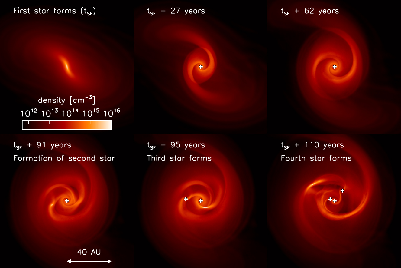 Der Heidelberger Astrophysiker Dr. Paul Clark und seine Kollegen haben diese Vorgänge mit Hilfe von Computersimulationen untersucht. Sie zeigen, dass dieses einfache Bild revidiert werden muss und es im frühen Universum nicht nur riesige Einzelsterne gab. Der Grund liegt in der Physik der sogenannten Akkretionsscheiben, die die Geburt der ersten Sterne begleitet haben. Der Gasnebel, aus dem sich ein neuer Stern bildet, rotiert. Dadurch fällt das Gas nicht direkt ins Zentrum; es bildet erst eine scheibenartige Struktur aus und kann nur durch interne Reibung weiter nach innen fließen. Wenn mehr Masse auf diese Scheibe einfällt als sie nach innen abtransportieren kann, wird sie instabil und zerfällt in mehrere Fragmente. Anstelle eines einzigen Sternes im Zentrum bildet sich dann eine Gruppe von mehreren Sternen – mit Abständen, die der Distanz zwischen Erde und Sonne vergleichbar sind.