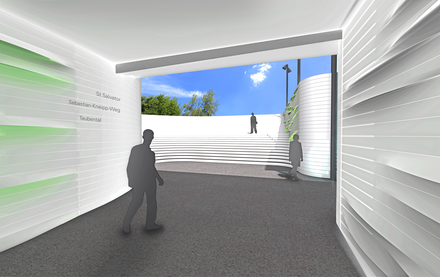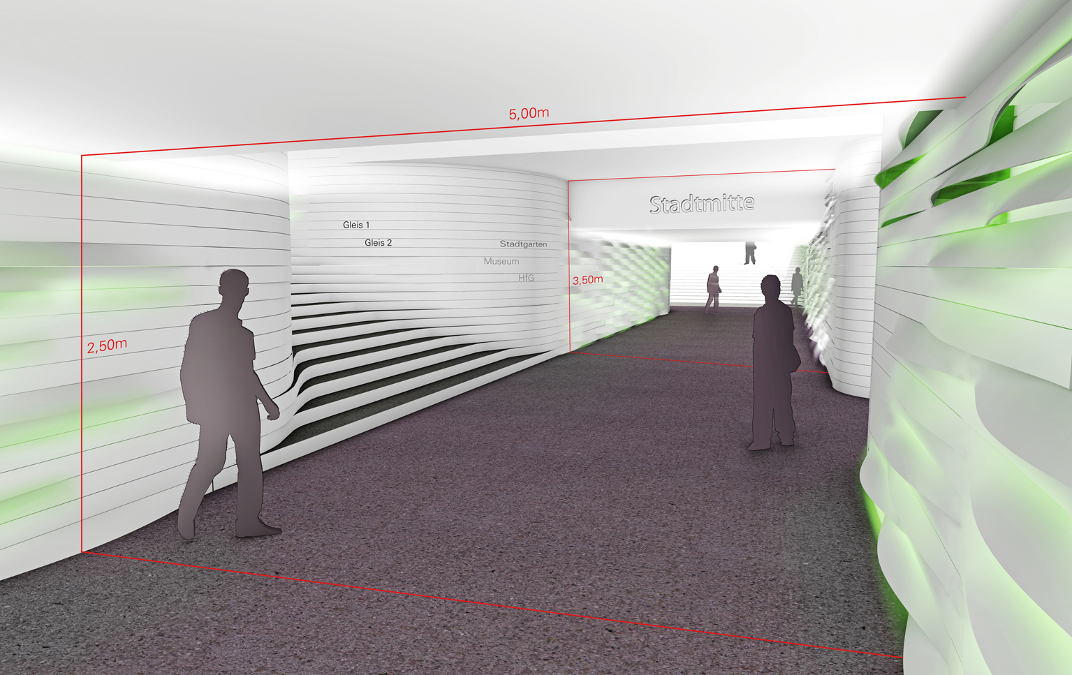 Das grüne Band verbindet den südlichen mit dem neuen nördlichen Stadtteil und den neu entstehenden Grünzonen. Es schlängelt sich wie ein Wegweiser durch die Unterführung, seine indirekte Beleuchtung hellt die Unterführung deutlich auf. Sobald Personen durchlaufen, wird das Licht der grünen Leuchtdioden noch intensiver und heller. Das Band zieht sich weiter über die Treppen bis hin zum Vorplatz, wo es beispielsweise in verschiedenen Sitzgelegenheiten auslaufen und damit das Stadtbild insgesamt auffrischen könnte.
