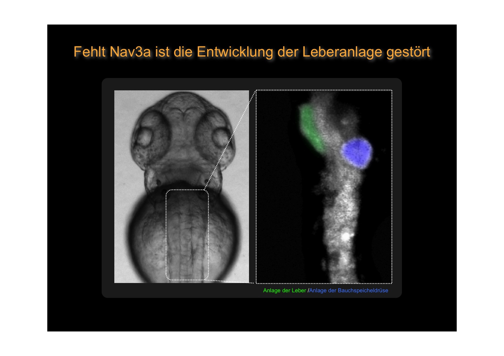 Seit einiger Zeit ist bekannt, dass Navigatorgene des Gehirns in der Frühphase der Embryonalentwicklung auch bei der Ausbildung des Gefäßsystems eine Rolle spielen. Mit diesem Thema befasst sich die Forschungsgruppe von Prof. le Noble. Im Rahmen seiner Arbeit am Zebrafisch stieß Dr. Klein, der in dieser Gruppe arbeitet, darauf, dass das Navigator-Gen nav3a ebenfalls bei der Entwicklung der Leber von Bedeutung ist.