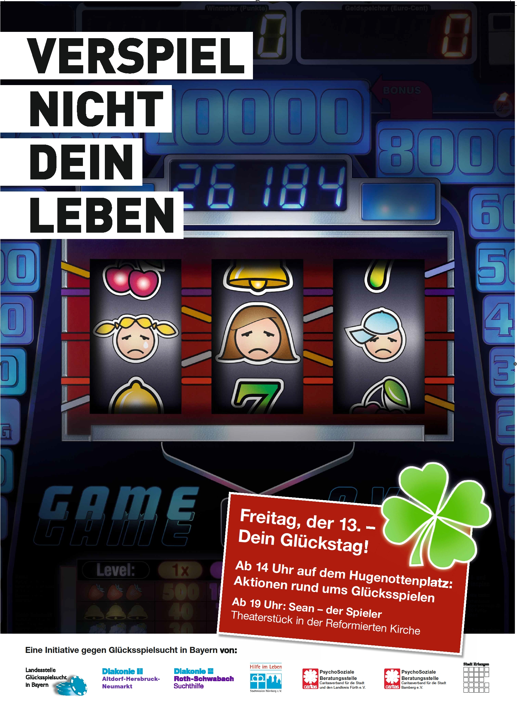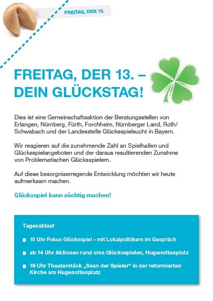 Da es in diesem Jahr nur einen Freitag, den 13. gibt, nutzen die mittel- und oberfränkischen Beratungsstellen dieses Datum gleichzeitig, um auch die breite Öffentlichkeit auf die Gefahren des Glücksspielens aufmerksam zu machen: Sie starten auf dem Erlanger Hugenottenplatz ab 14 Uhr die Aktion „Freitag, der 13. – Dein Glückstag“ mit wichtigen Fakten rund um die Glücksspielsucht und zu Beratungsangeboten. Um 19 Uhr spielt die Theatergruppe Thevo das Stück „Sean – der Spieler“ in der Reformierten Kirche Erlangen.